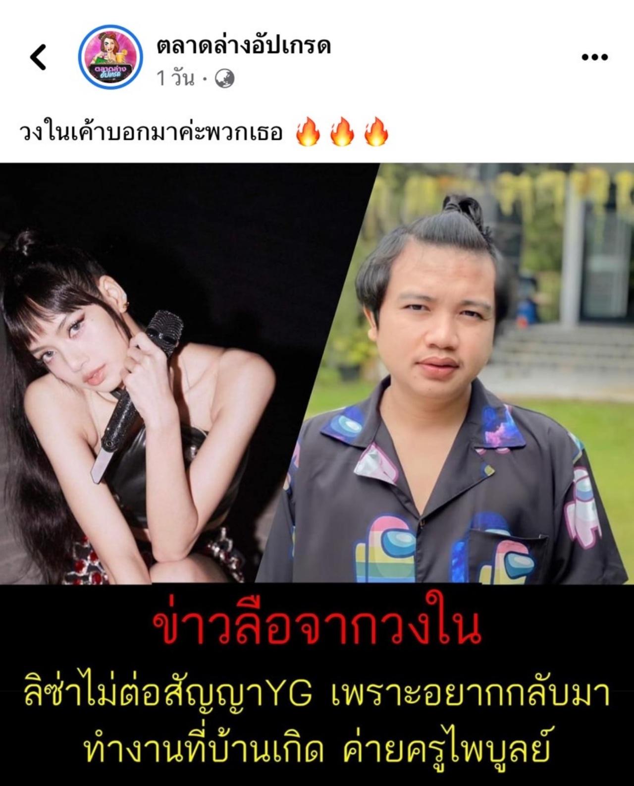 จากนั้นทางเพจ ตลาดล่างอัปเกรด ก็ได้ออกมาโพสต์ข้อความ "ข่าวลือจากวงใน ลิซ่าไม่ต่อสัญญา YG เพราะอยากกลับมาทำงานที่บ้านเกิด ค่ายครูไพบูลย์" งานนี้มีชาวเน็ตเข้ามากดไลค์ แชร์โพสต์และแสดงความคิดเห็นกันจำนวนมาก