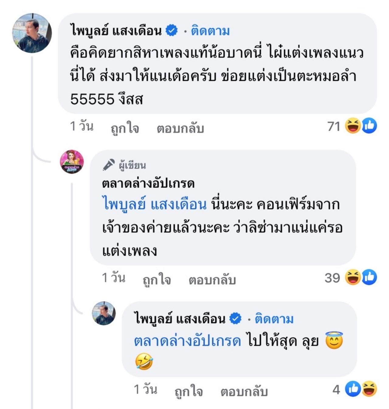 ทางด้าน ครูไพบูลย์ แสงเดือน ก็ได้เข้ามาคอมเมนต์ตอบกลับว่า "คือคิดยากสิหาเพลงแท้น้อบาดนี่ ไผ๋แต่งเพลงแนวนี่ได้ ส่งมาให้แนเด้อครับ ข่อยแต่งเป็นตะหมอลำ 55555 งึสส" และทางเพจก็ได้เข้ามาเขียนแซวว่า "นี่นะคะ คอนเฟิร์มจากเจ้าของค่ายแล้วนะคะ ว่าลิซ่ามาแน่แค่รอแต่งเพลง" และครูไพบูลย์ก็ได้ตอบกลับว่า "ไปให้สุด ลุย"