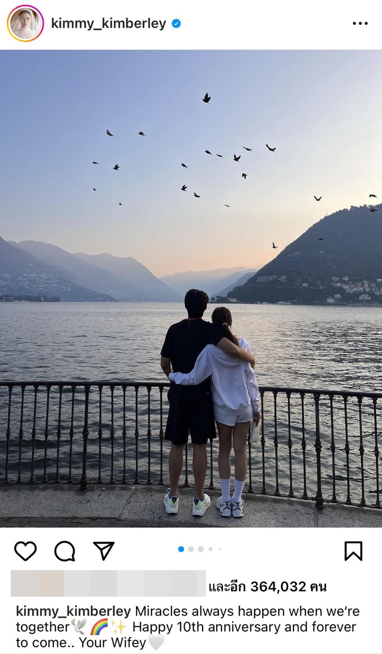 "Miracles always happen when we‘re together Happy 10th anniversary and forever to come.. Your Wifey" (ปาฏิหาริย์เกิดขึ้นเสมอเมื่อเราอยู่ด้วยกัน สุขสันต์วันครบรอบ 10 ปีและตลอดไป.. ภรรยาของคุณ).