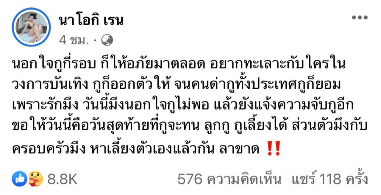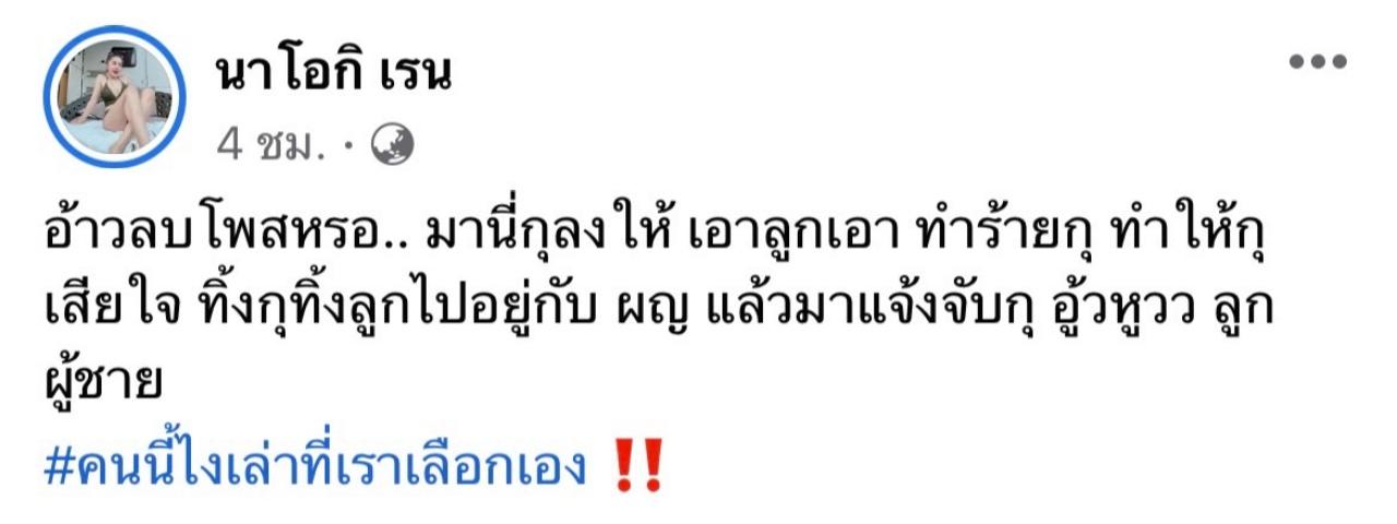 วันนี้มึงนอกใจกูไม่พอ แล้วยังแจ้งความจับกูอีก ขอให้วันนี้คือวันสุดท้ายที่กูจะทน ลูกกู กูเลี้ยงได้ ส่วนตัวมึงกับครอบครัวมึง หาเลี้ยงตัวเองแล้วกัน ลาขาด ‼️”