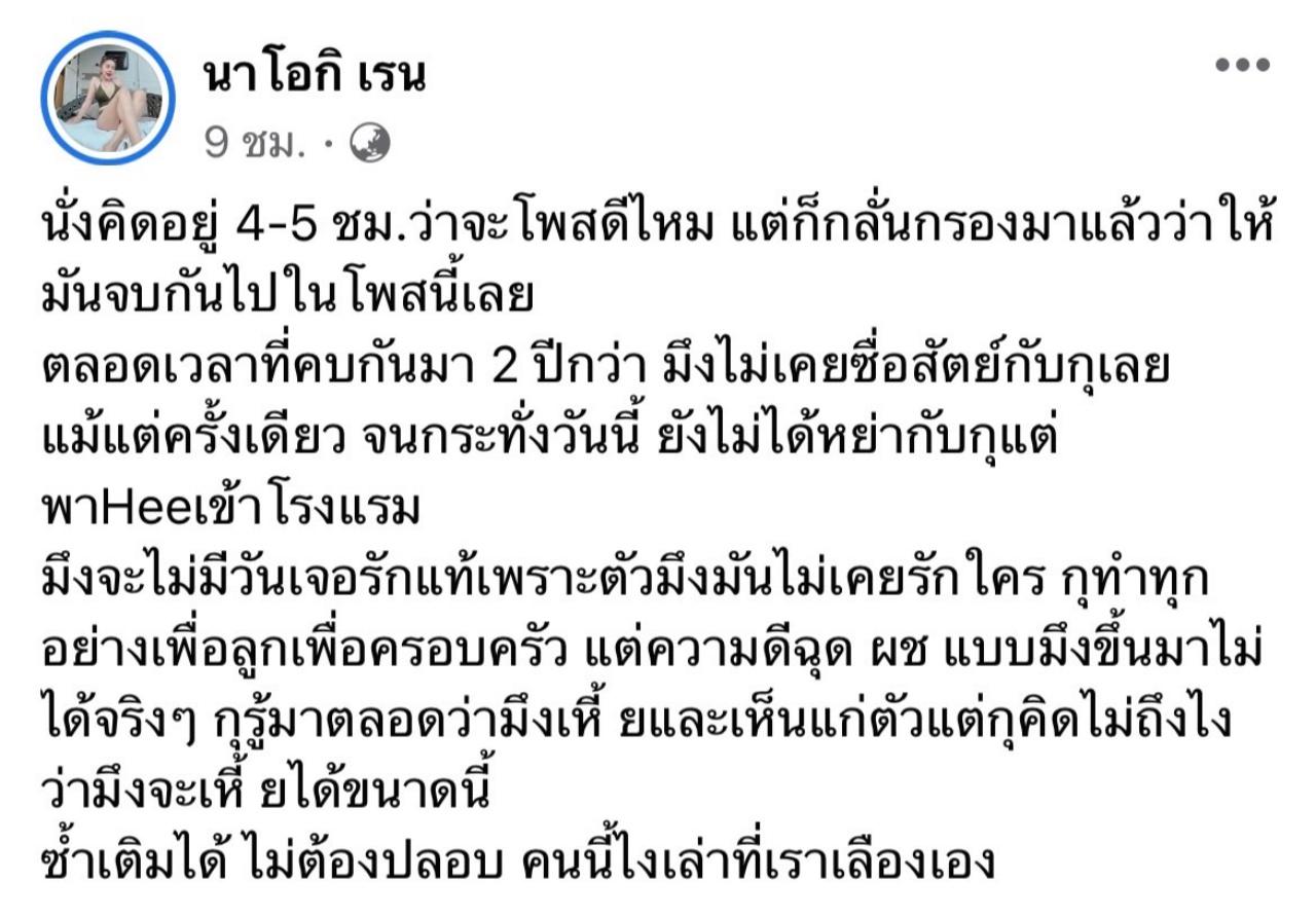 “นั่งคิดอยู่ 4-5 ชม.ว่าจะโพสดีไหม แต่ก็กลั่นกรองมาแล้วว่าให้มันจบกันไปในโพสนี้เลย ตลอดเวลาที่คบกันมา 2 ปีกว่า มึงไม่เคยซื่อสัตย์กับกูเลยแม้แต่ครั้งเดียว จนกระทั่งวันนี้ ยังไม่ได้หย่ากับกูแต่พาH….เข้าโรงแรม มึงจะไม่มีวันเจอรักแท้เพราะตัวมึงมันไม่เคยรักใคร
