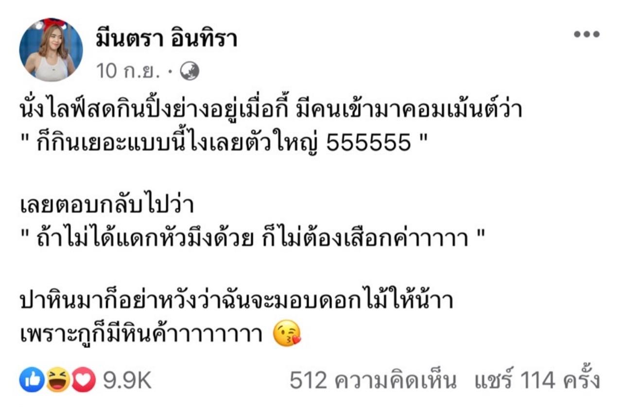 "นั่งไลฟ์สดกินปิ้งย่างอยู่เมื่อกี้ มีคนเข้ามาคอมเมนต์ว่า "ก็กินเยอะแบบนี้ไงเลยตัวใหญ่ 555555" เลยตอบกลับไปว่า "ถ้าไม่ได้แดกหัวมึงด้วย ก็ไม่ต้องเ_ือกค่าาาา" ปาหินมาก็อย่าหวังว่าฉันจะมอบดอกไม้ให้น้าา เพราะกูก็มีหินค้าาาาาาาา"