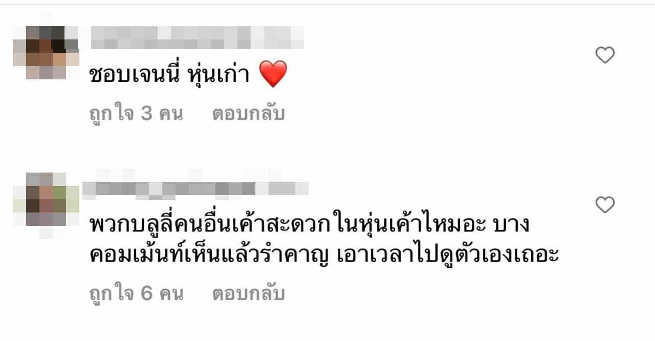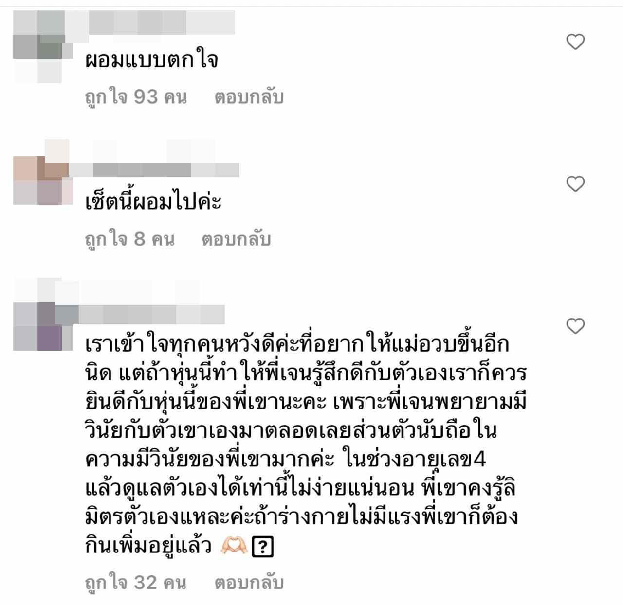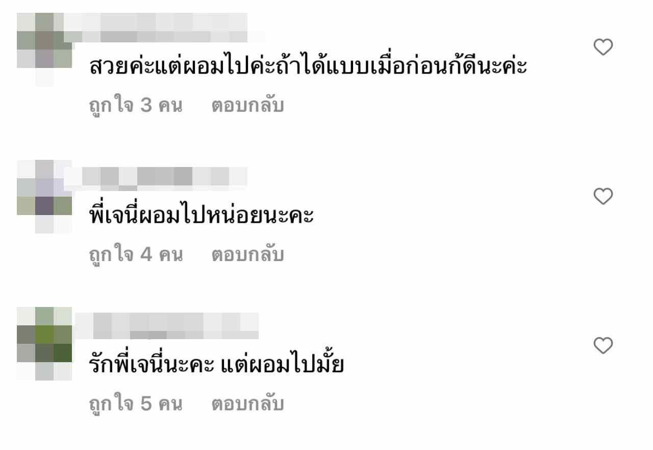"ผอมไปค่ะ ชอบเจนี่แบบเมื่อก่อนน่ารักมาก, ผอมแบบตกใจ, เซตนี้ผอมไปค่ะ, จริงค่ะ ไม่อยากให้ดูเหมือนขาดสารอาหาร, พูดถูกค่ะ แต่อาจจะเป็นการใช้แอปแต่งรูปภาพหรือเปล่าทำให้นางผอม ตัวจริงอาจสวยเหมือนนางฟ้าเจนี่, ชอบเจนี่หุ่นเก่า, รักพี่เจนี่นะคะ แต่ผอมไปมั้ย"