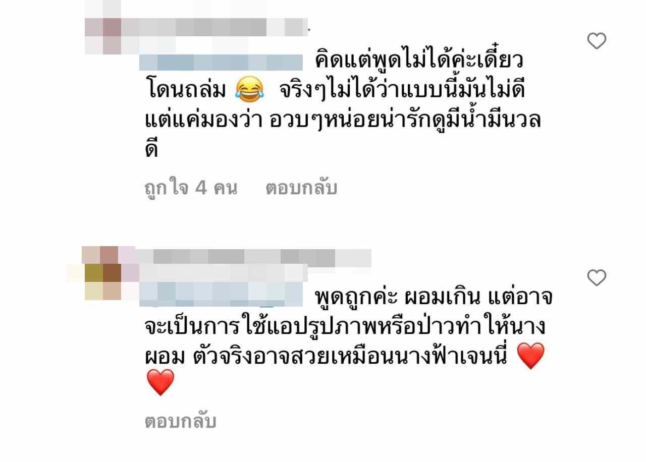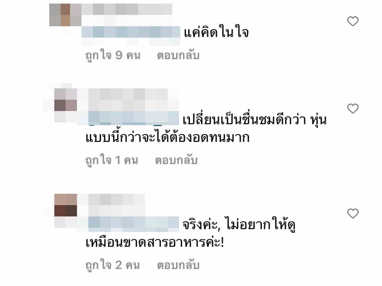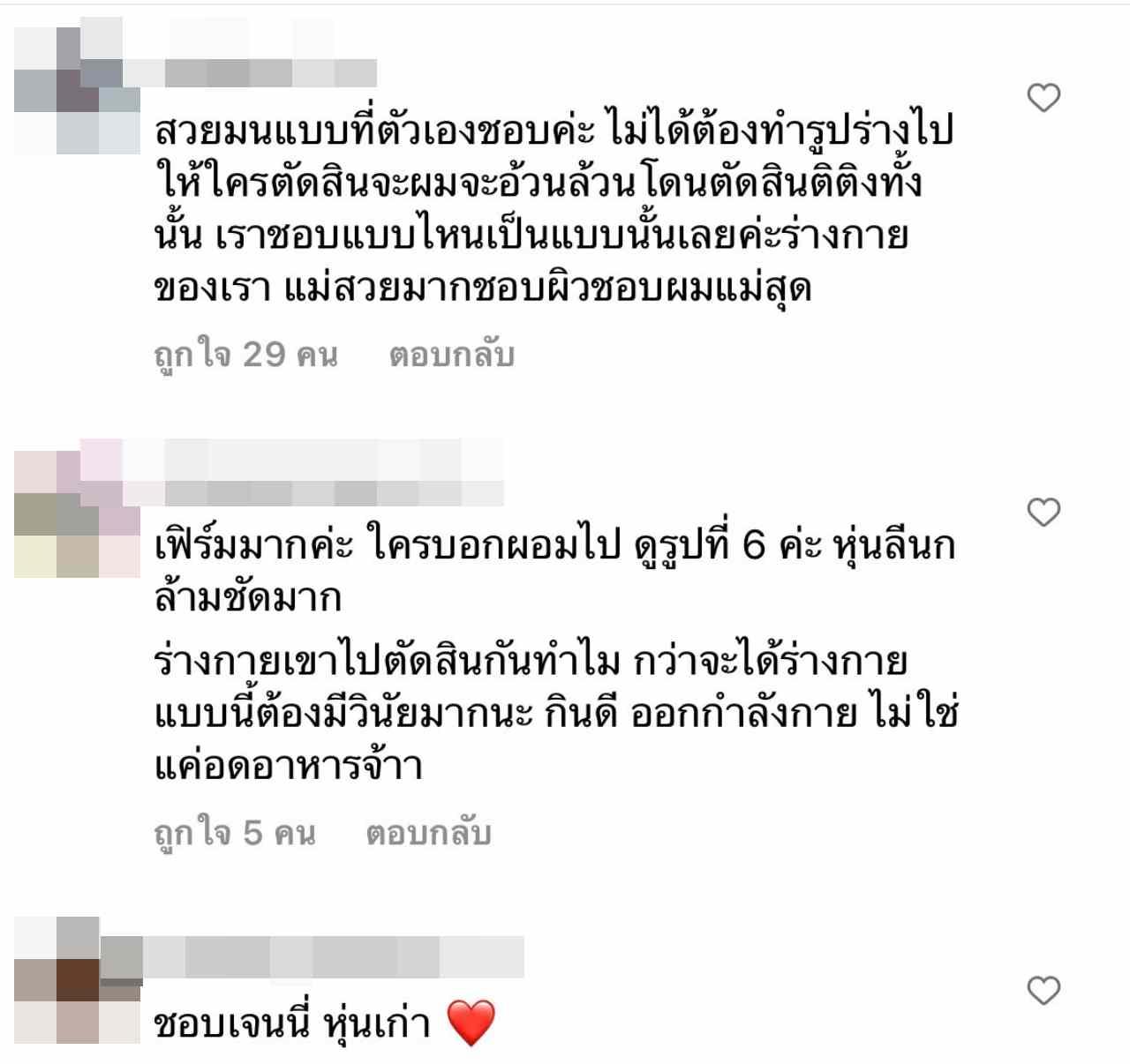 แต่ก็มีชาวเน็ตบางคนเข้ามาคอมเมนต์แสดงความคิดเห็นในอีกมุมหนึ่งว่า "สวยในแบบที่ตัวเองชอบค่ะ ไม่ได้ต้องทำรูปร่างไปให้ใครตัดสินจะผอมจะอ้วนโดนตัดสินติติงทั้งนั้น เราชอบแบบไหน เป็นแบบนั้นเลยค่ะ ร่างกายของเรา แม่สวยมาก ชอบผิวแบบแม่สุด,