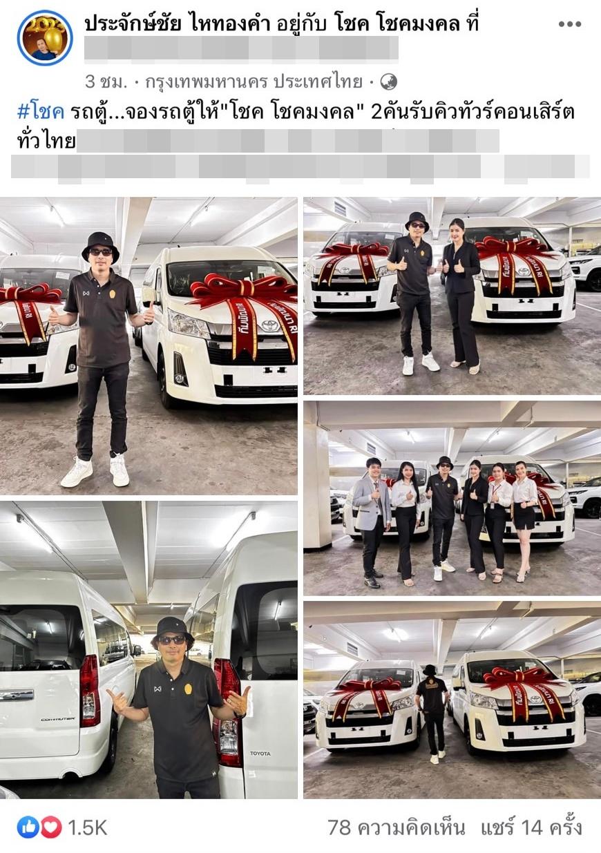 อีกทั้งยังโพสต์ภาพตอนไปจองรถตู้ 2 คันให้กับ โชค พร้อมทั้งเขียนข้อความว่า “#โชค รถตู้...จองรถตู้ให้ "โชค โชคมงคล" 2 คัน รับคิวทัวร์คอนเสิร์ตทั่วไทย” โดยมีแฟนๆ ที่ต่างเข้ามาอวยพรขอให้เฮงๆ รวยๆ ขับแล้วรับทรัพย์ ฯลฯ.