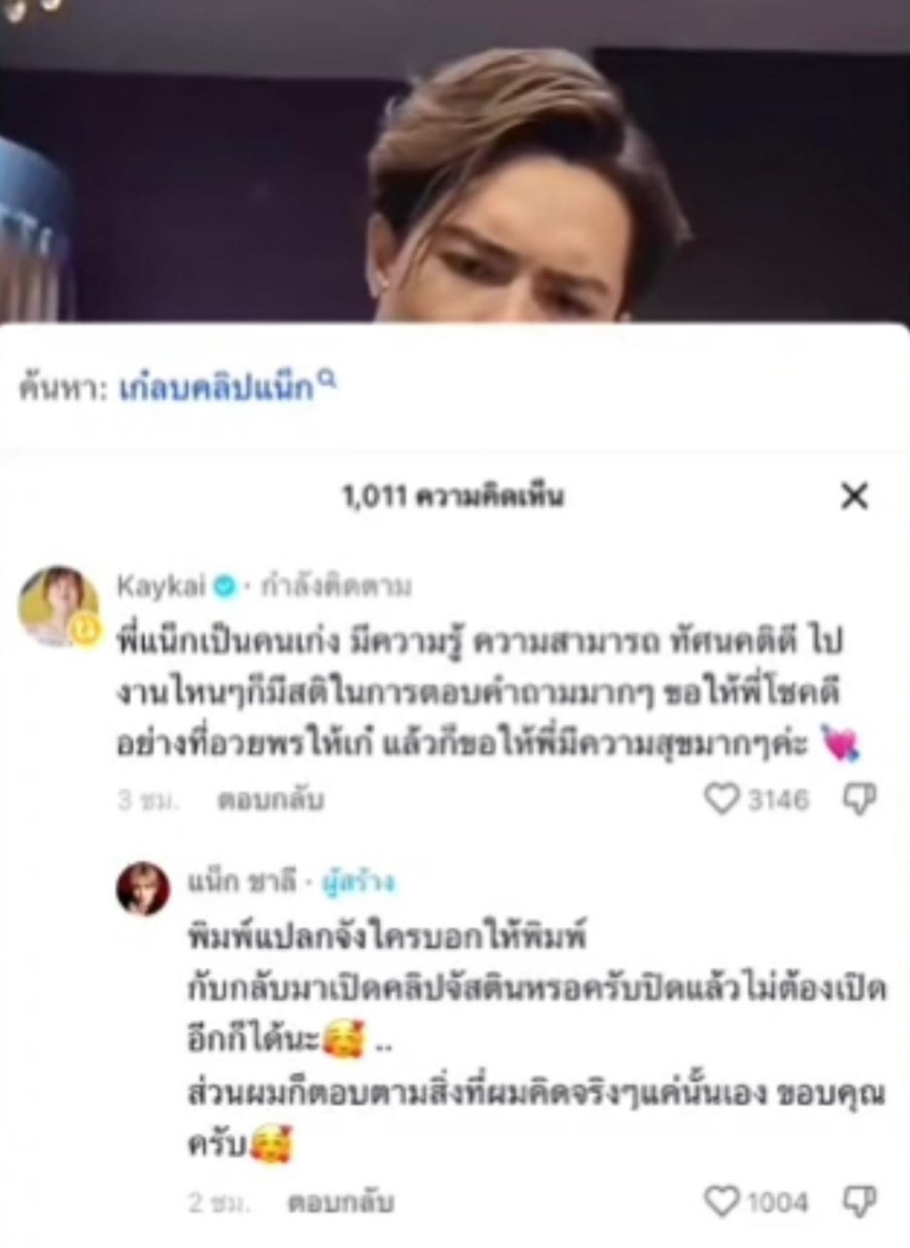 นอกจากนี้ยังมีคนตาดีเห็น เก๋ไก๋ ได้เข้ามาคอมเมนต์ในช่อง TikTok ของ แน็ก ชาลี ว่า "พี่แน็กเป็นคนเก่ง มีความรู้ ความสามารถ ทัศนคติดี ไปงานไหนๆ ก็มีสติในการตอบคำถามมากๆ ขอให้พี่โชคดีอย่างที่อวยพรให้เก๋ไก๋ แล้วขอให้พี่มีความสุขมากๆ ค่ะ"