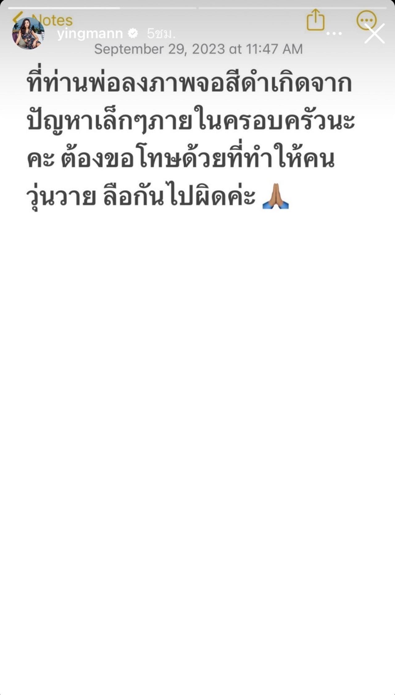 "ที่ท่านพ่อลงภาพจอสีดำเกิดจากปัญหาเล็กๆ ภายในครอบครัวนะคะ ต้องขอโทษด้วยที่ทำให้คนวุ่นวาย ลือกันไปผิดค่ะ".