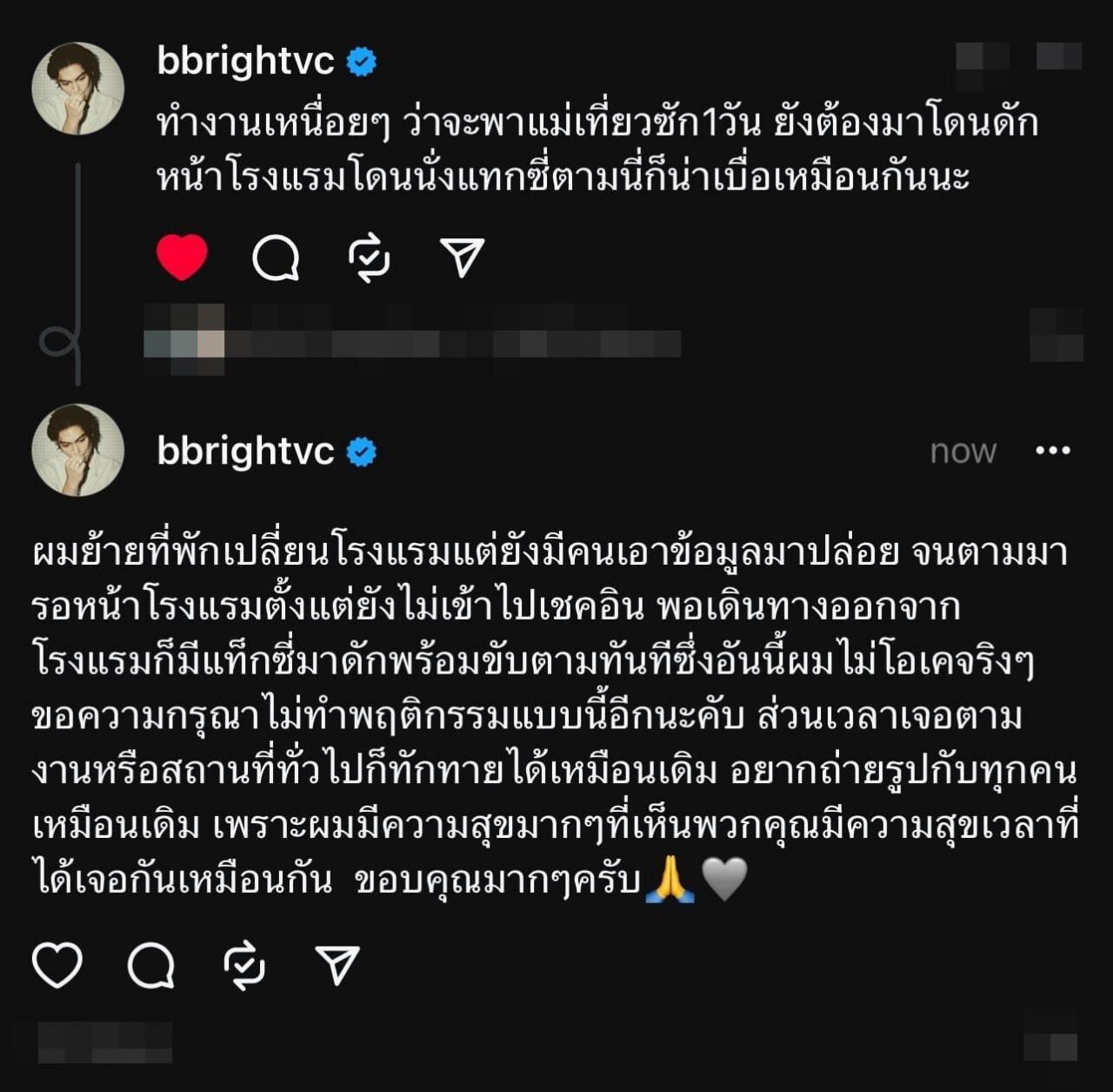 โดย ไบร์ท ได้ทวีตข้อความระบุว่า “ทำงานเหนื่อยๆ ว่าจะพาแม่เที่ยวสัก 1 วัน ยังต้องมาโดนดักหน้าโรงแรม โดนนั่งแท็กซี่ตาม นี่ก็น่าเบื่อเหมือนกันนะ”