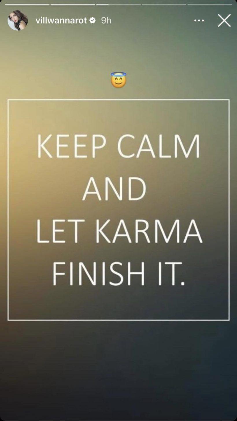เพราะก่อนหน้านี้ วิว วรรณรท ก็ได้โพสต์ภาพข้อความภาษาอังกฤษ “KEEP CALM AND LET KARMA FINISH IT.” ซึ่งมีความหมายประมาณว่า "อยู่นิ่งๆ ปล่อยให้เวรกรรมทำงาน" ลงในไอจีสตอรี่ จนหลายคนอดสงสัยไม่ได้ว่าจะสื่อถึงใครและเรื่องอะไรกันแน่