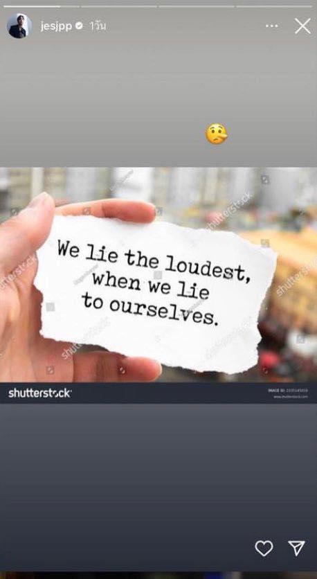 แต่ล่าสุดในไอจีส่วนตัวของ เจษ เจษฎ์พิพัฒ ก็ได้โพสต์ภาพข้อความภาษาอังกฤษว่า “We lie the loudest when we lie to ourselves.” ซึ่งแปลว่า “เราโกหกเสียงดังที่สุด เมื่อเราโกหกตัวเอง” พร้อมทั้งใส่อีโมจิพิน็อกคิโอที่มีจมูกยาวๆ ลงในไอจีสตอรี่ แต่ทั้งนี้จะสื่อถึงเรื่องอะไรและหมายถึงใคร คงต้องรอถามจากเจ้าตัวเองดีกว่า.