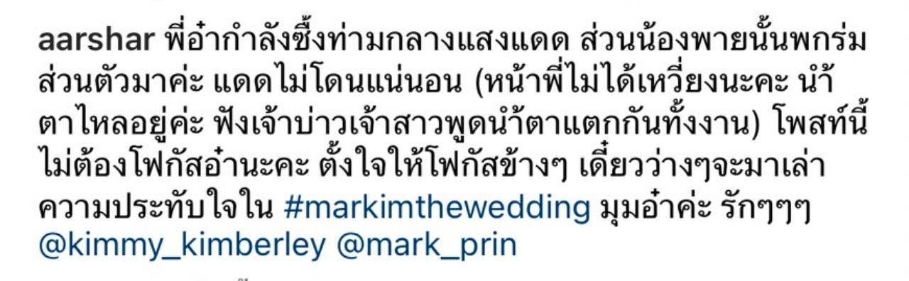 “ไม่ได้บอกอะไร คือไม่ได้คุยกัน ก็ไม่คิดด้วยว่าจะมีรูปนั้นออกมา เพราะอย่างที่บอกโมเมนต์นั้นเป็นโมเมนต์ที่พิเศษมาก ซึ่งคนรอบข้างแดดร้อน แต่เราก็โฟกัสที่พี่หมากกับคิม ร้องไห้ไปกับเขา ยิ้มแย้มดีใจไปกับเขา เลยไม่ได้โฟกัสว่า เอ๊ะ ตรงนี้ หรือไม่ได้หันไปดูว่าพี่อ๋าร้อนไหม ก็ต้องขอโทษด้วย (หัวเราะ)”