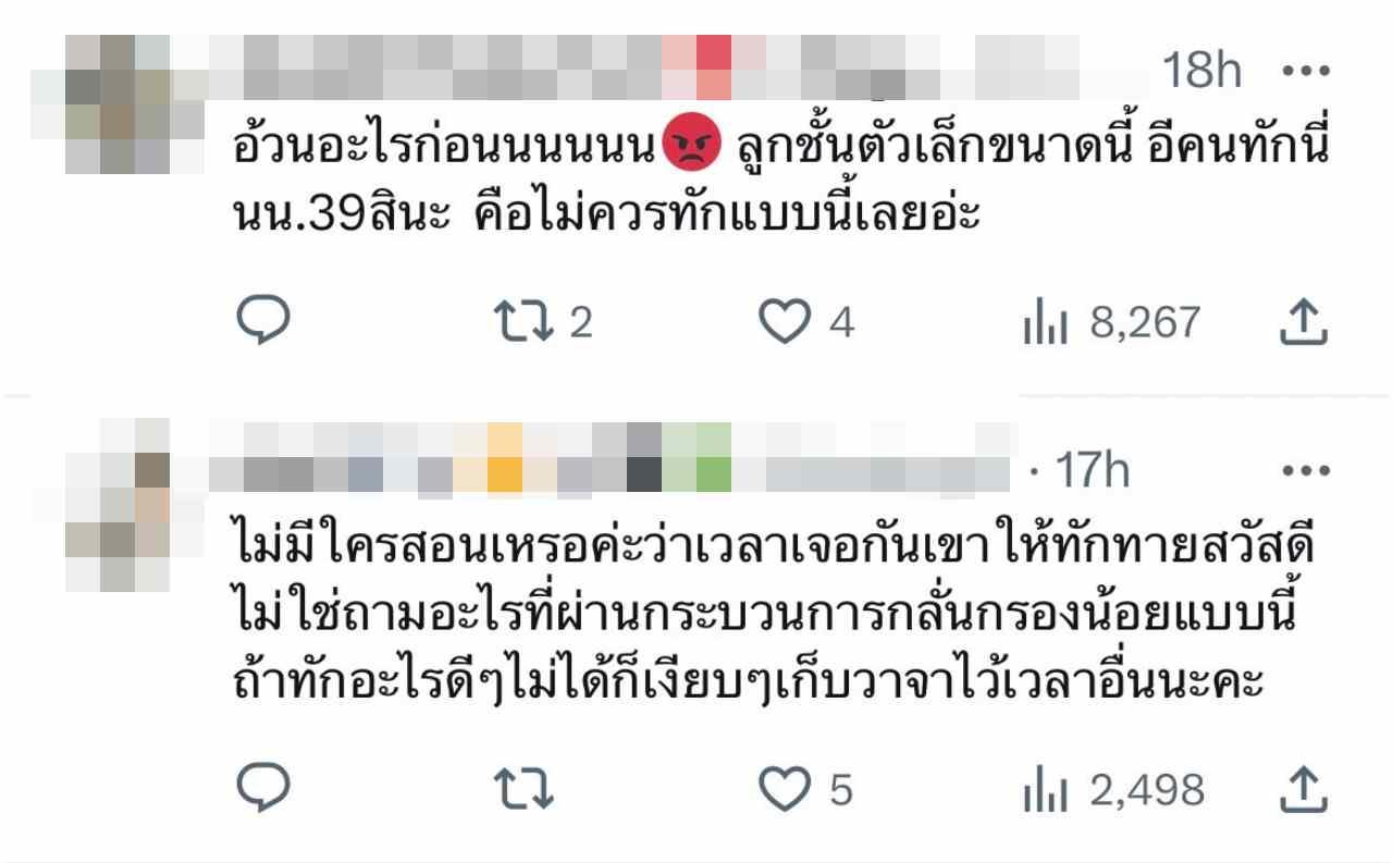 การทักแบบนี้เขาไม่เรียกว่าทักนะ มันเหมือนบูลลี่อะ คำพูดพวกนี้มันทำให้คนเสียความมั่นใจได้เลยนะ มันควรคิดก่อนที่จะพูดอะไรพวกนี้, เค้าทักกันแบบนี้แล้วเหรอ = มารยาทนิดนึงนะคะ, คนทักนี่ สำนึกบ้างไหม มันใช่คำทักทายหรอถามจริง"