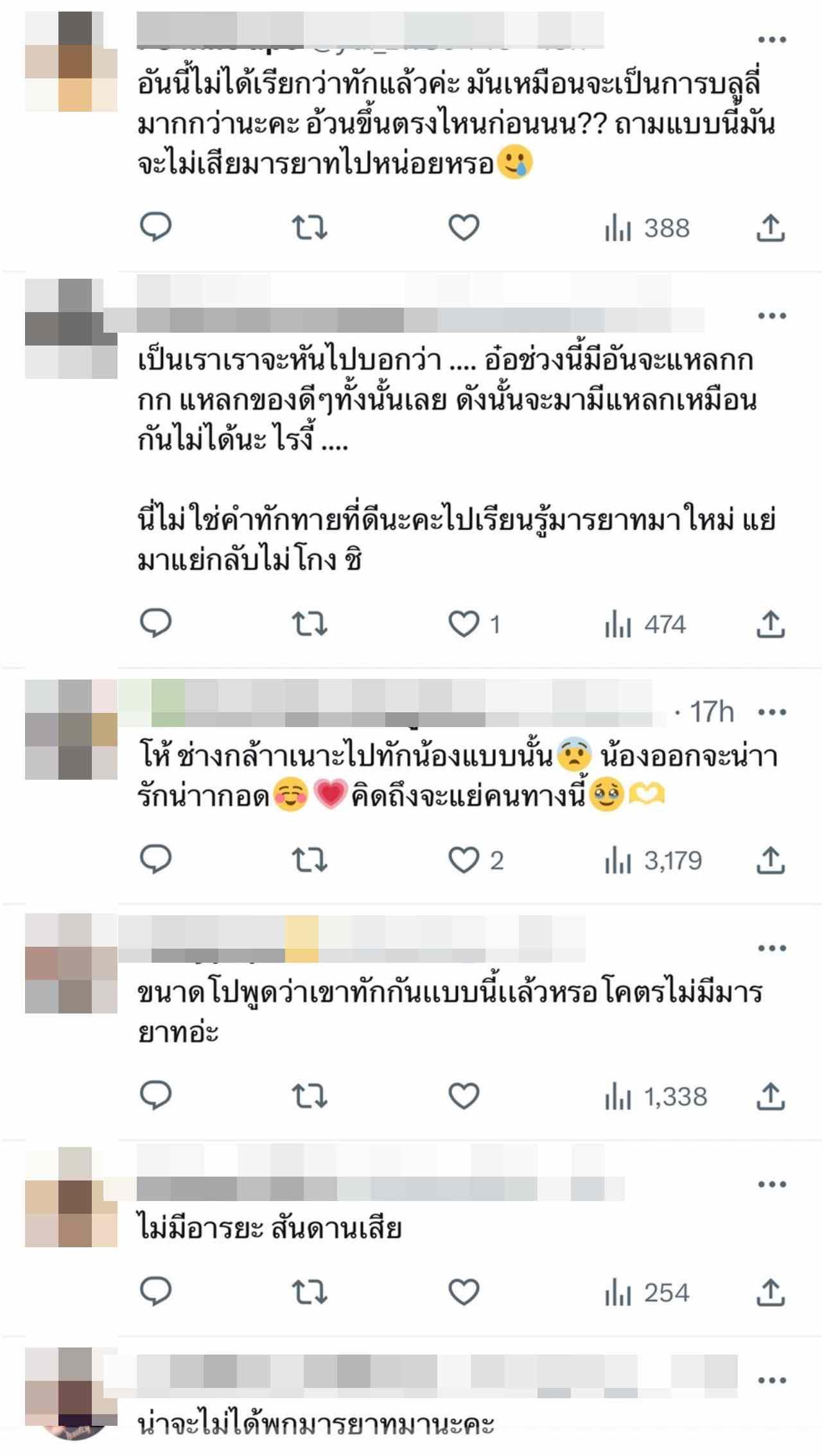 หลังจากที่ชาวเน็ตได้เห็นคลิปดังกล่าว ก็ได้เข้ามาแสดงความคิดเห็นอย่างมากมายว่า "อ้วนอะไรก่อนนนนน ลูกฉันตัวเล็กขนาดนี้ _คนทักนี่ นน.39 สินะ คือไม่ควรทักแบบนี้เลยอะ, ไม่มีใครสอนเหรอคะ ว่าเวลาเจอกันเขาให้ทักทายสวัสดี ไม่ใช่ถามอะไรที่ผ่านกระบวนการกลั่นกรองน้อยแบบนี้ ถ้าทักอะไรดีๆ ไม่ได้ก็เงียบๆ เก็บวาจาไว้เวลาอื่นนะคะ,