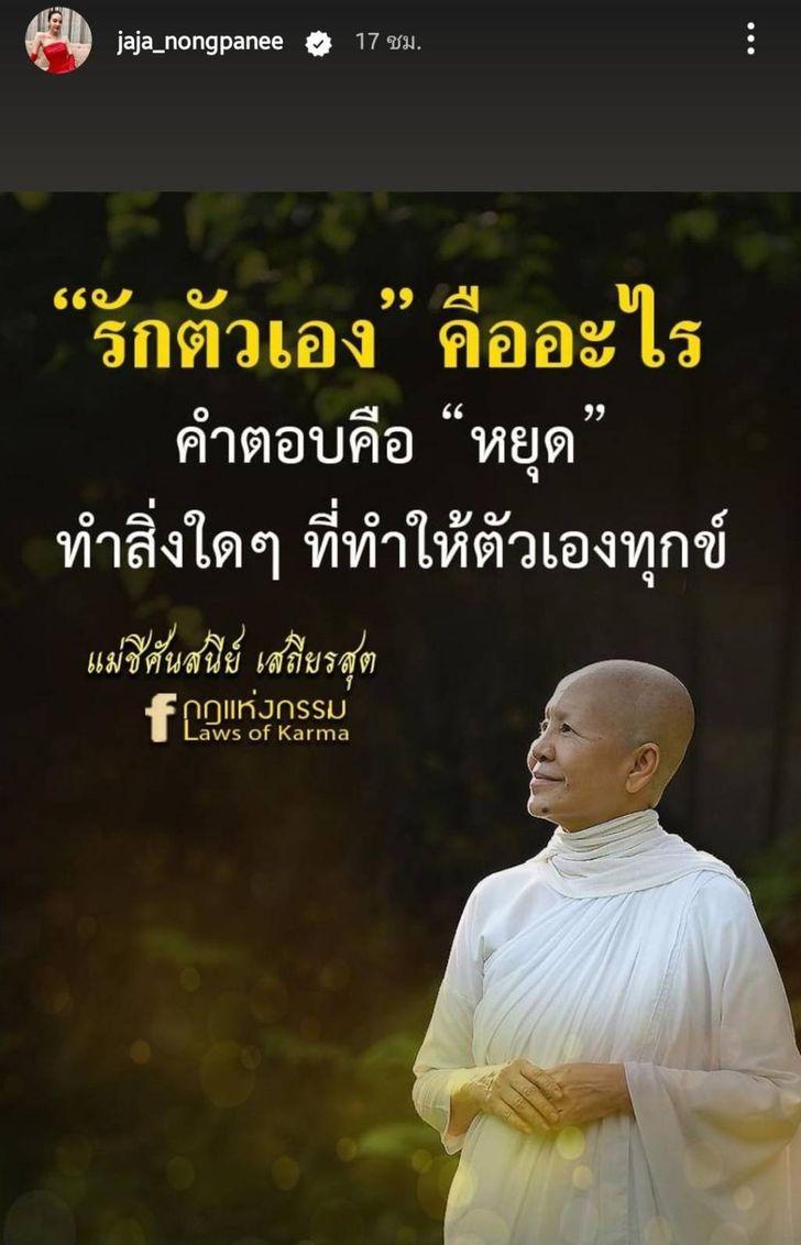 ล่าสุด จ๊ะ นงผณี เคลื่อนไหวไอจีอีกครั้ง โพสต์ภาพข้อความที่เป็นข้อคิดจาก แม่ชีศันสนีย์ เสถียรสุต ซึ่งเขียนว่า “รักตัวเอง” คืออะไร คำตอบคือ “หยุด” ทำสิ่งใดๆ ที่ทำให้ตัวเองทุกข์.