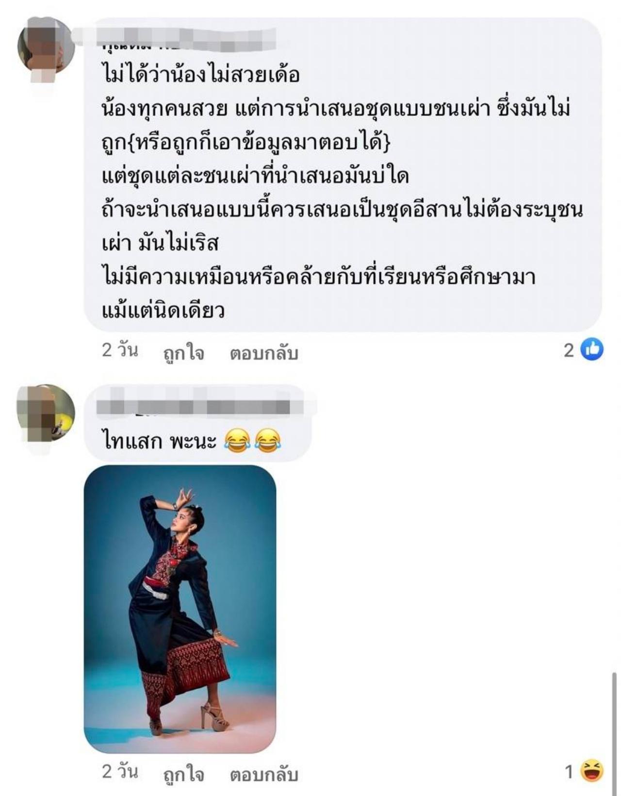 โดยเฉพาะชุด "ไทโซ่ หรือ ไทกะโซ่" ที่เทรนนี (ผู้เข้าประกวด) อย่าง "บุษซ่า บุษปภัทร เสขะกุล" สวมใส่ ด้วยการตั้งคำถามว่า "ศึกษาข้อมูลดีแล้วหรอครับ" พร้อมทั้งมีการแชร์ต่อๆ ทำให้เกิดคอมเมนต์ต่างๆ อาทิ นี้ชุดไทโซ่หรอคะ, โส้ไม่ใช่หรอพี่, โส้ไทอุบล อย่าเถียงเพิ่ลผู้เฮดชุด, ผ้าเบี่ยงชัดมากๆๆๆ, ขอร้อง เข้าไม่ถึงจริงๆ โส้/โซ่ แถวไหนขอข้อมูลหน่อย????, ชุดชนเผ่าเป็นเรื่องละเอียดอ่อนมากเลยนะ มากๆๆๆ รถทัวร์วัฒนธรรมมันแรงนะ" เป็นต้น