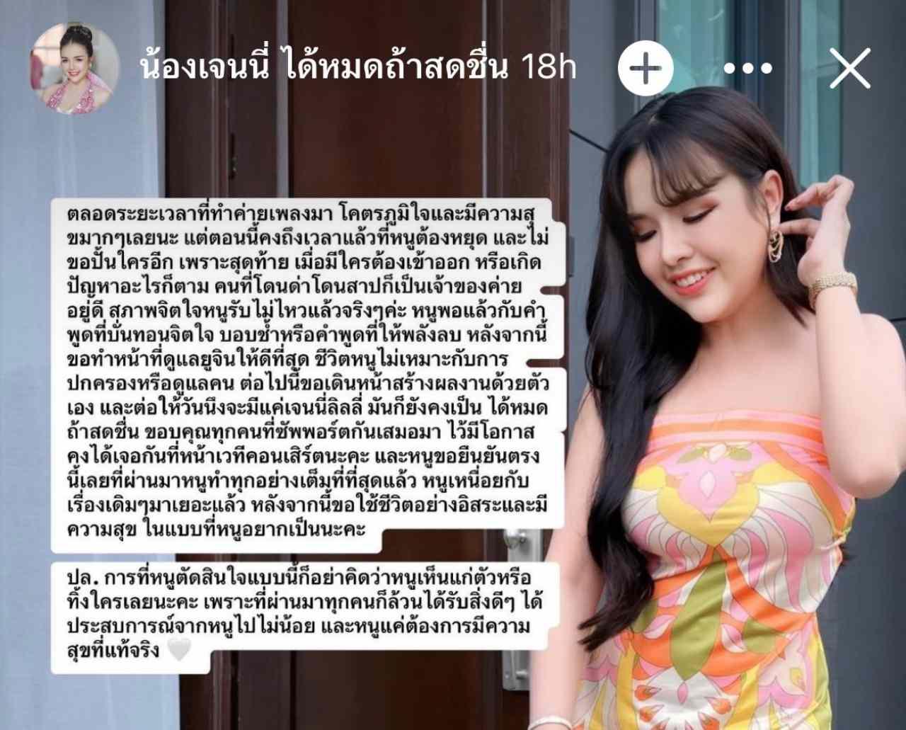 ต่อไปนี้ขอเดินหน้าสร้างผลงานด้วยตัวเอง และต่อให้วันหนึ่งจะมีแค่ เจนนี่ ลิลลี่ มันก็ยังคงเป็น ได้หมดถ้าสดชื่น ขอบคุณทุกคนที่ซัพพอร์ตกันเสมอมา ไว้มีโอกาสคงได้เจอกันที่หน้าเวทีคอนเสิร์ตนะคะและหนูขอยืนยันตรงนี้เลย