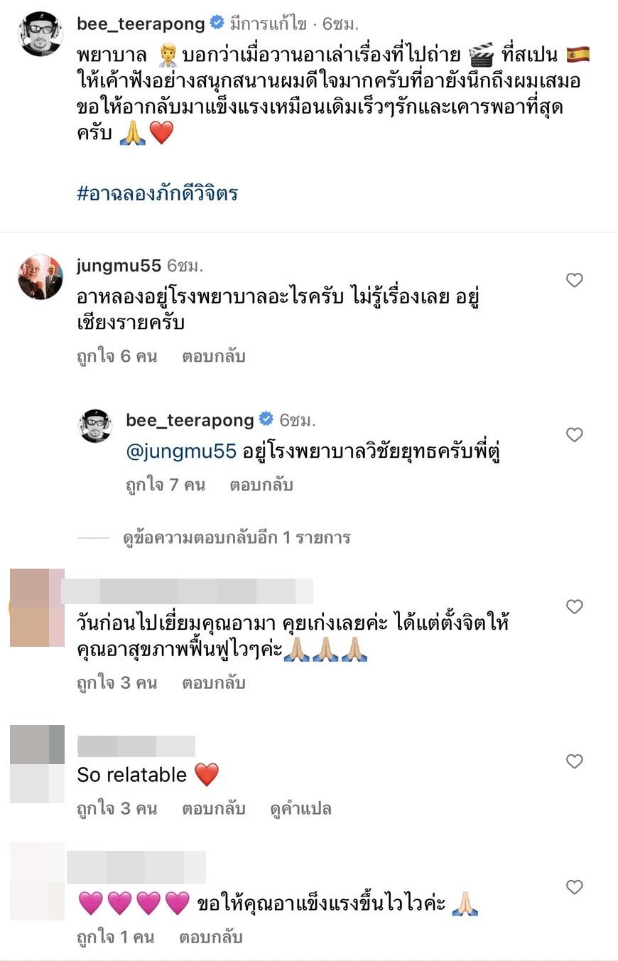 ซึ่งหลังจากที่โพสต์ภาพและข้อความไป ตู่ นพพล โกมารชุน นักแสดง-ผู้จัดละครชื่อดัง ก็ได้เข้ามาคอมเมนต์สอบถามถึงเรื่องนี้ว่า “อาหลองอยู่โรงพยาบาลอะไรครับ ไม่รู้เรื่องเลย อยู่เชียงรายครับ” และ บี๋ ธีรพงศ์ ตอบกลับว่า “อยู่โรงพยาบาลวิชัยยุทธครับพี่ตู่”.
