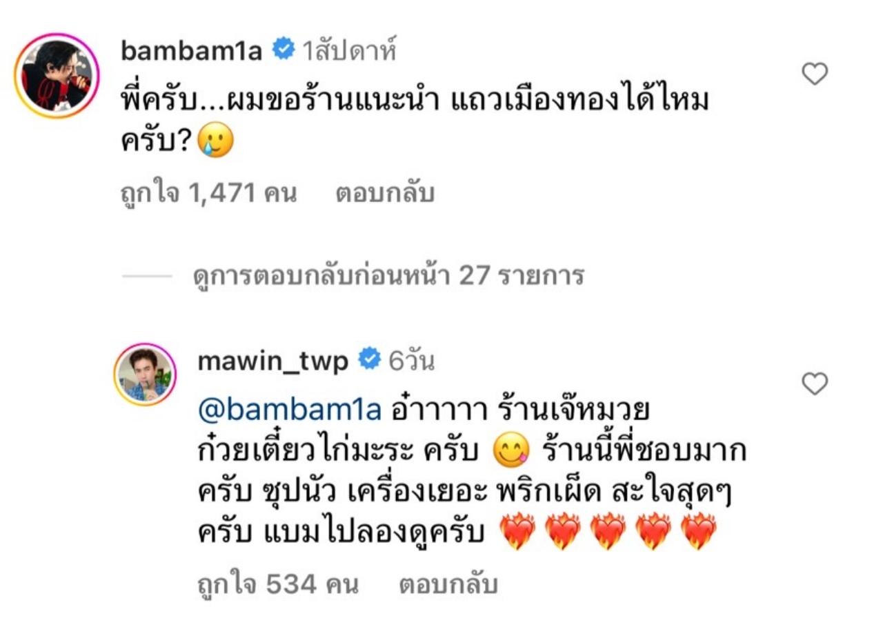"พี่ครับ...ผมขอร้านแนะนำ แถวเมืองทองได้ไหมครับ?" ซึ่งมาวินก็ไม่รอช้า มาชี้พิกัดร้านเด็ดให้แบมแบมไว้ว่า "อ๋าาาาา ร้านเจ้หมวยก๋วยเตี๋ยวไก่มะระ ครับ ร้านนี้พี่ชอบมากครับ ซุปนัว เครื่องเยอะ พริกเผ็ด สะใจสุดๆ ครับ แบมไปลองดูครับ"