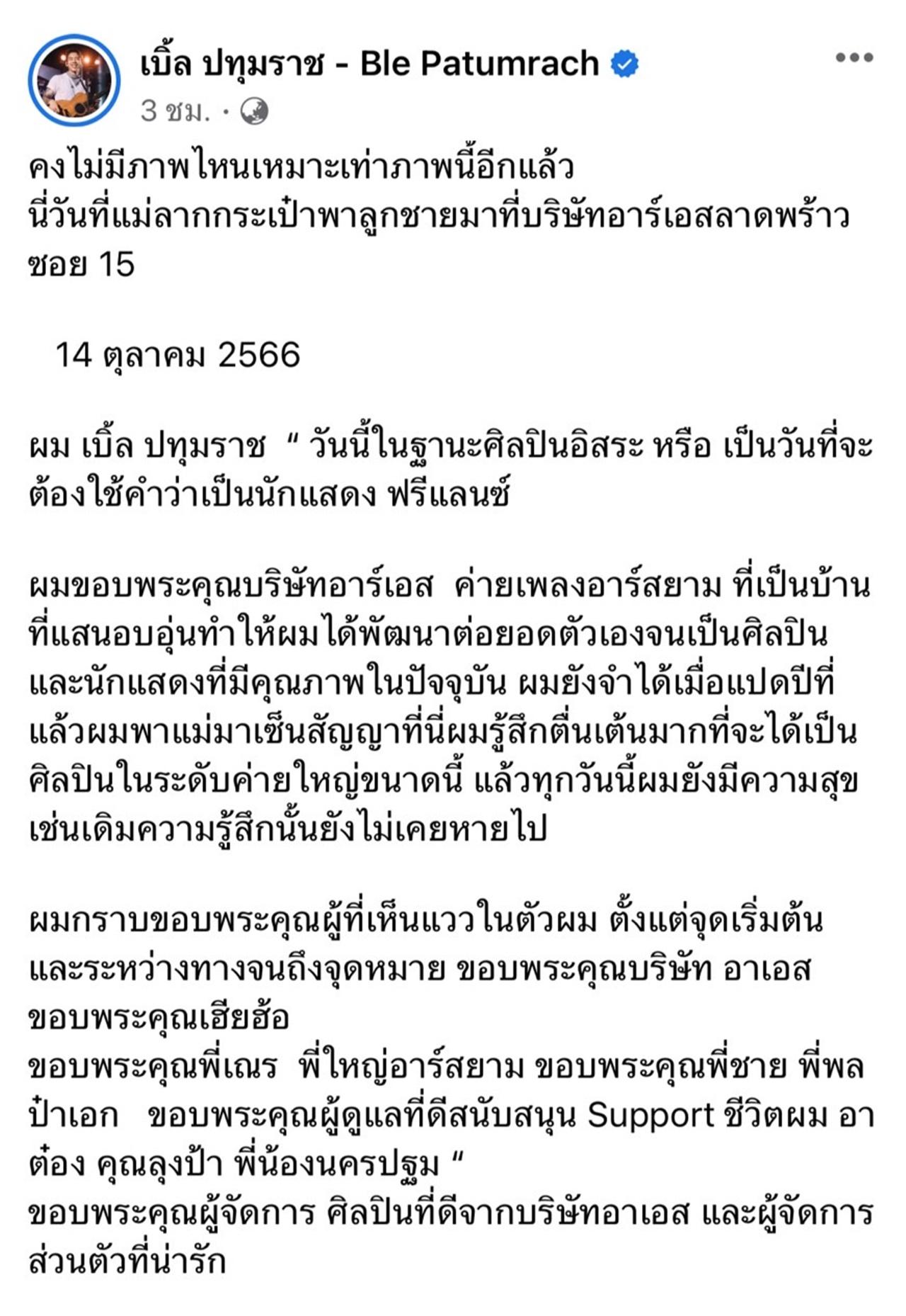 ผม เบิ้ล ปทุมราช วันนี้ในฐานะศิลปินอิสระ หรือ เป็นวันที่จะต้องใช้คำว่าเป็นนักแสดง ฟรีแลนซ์ ผมขอบพระคุณบริษัทอาร์เอส ค่ายเพลงอาร์สยาม ที่เป็นบ้านที่แสนอบอุ่นทำให้ผมได้พัฒนาต่อยอดตัวเองจนเป็นศิลปินและนักแสดงที่มีคุณภาพในปัจจุบัน