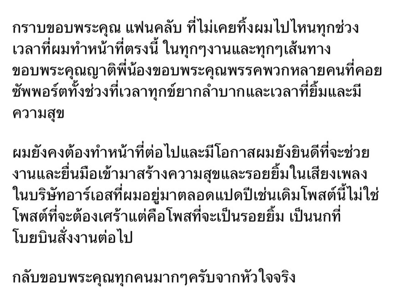 ผมยังคงต้องทำหน้าที่ต่อไปและมีโอกาสผมยังยินดีที่จะช่วยงานและยื่นมือเข้ามาสร้างความสุขและรอยยิ้มในเสียงเพลงในบริษัทอาร์เอสที่ผมอยู่มาตลอดแปดปีเช่นเดิม โพสต์นี้ไม่ใช่โพสต์ที่จะต้องเศร้าแต่คือโพสต์ที่จะเป็นรอยยิ้ม เป็นนกที่โบยบินสั่งงานต่อไป ขอบพระคุณทุกคนมากๆ ครับ จากหัวใจจริง".