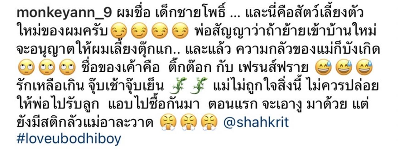 "ผมชื่อ เด็กชายโพธิ์ … และนี่คือสัตว์เลี้ยงตัวใหม่ของผมครับ พ่อสัญญาว่าถ้าย้ายเข้าบ้านใหม่จะอนุญาตให้ผมเลี้ยงตุ๊กแก.. และแล้ว ความกลัวของแม่ก็บังเกิด ชื่อของเค้าคือ ติ๊กต๊อก กับ เฟรนส์ฟราย รักเหลือเกิน จุ๊บเช้าจุ๊บเย็น แม่ไม่ถูกใจสิ่งนี้ ไม่ควรปล่อยให้พ่อไปรับลูก แอบไปซื้อกันมา ตอนแรก จะเอางู มาด้วย แต่ยังมีสติกลัวแม่อาละวาด @shahkrit #loveubodhiboy"