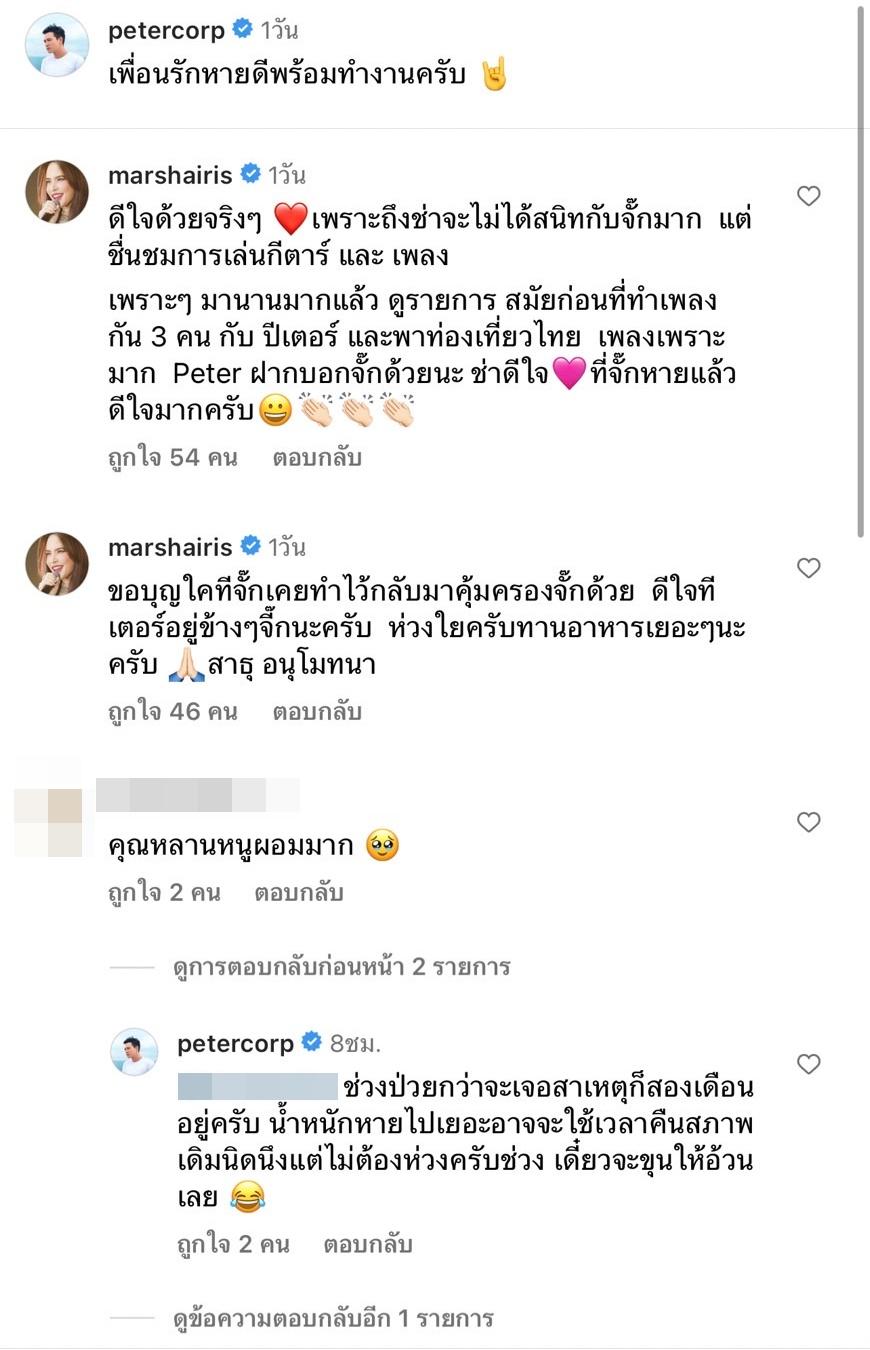 ซึ่งหลังจากที่ ปีเตอร์ โพสต์ภาพไป มาช่า วัฒนพานิช ก็เข้ามาแสดงความคิดเห็นว่า “ดีใจด้วยจริงๆ เพราะถึงช่าจะไม่ได้สนิทกับจั๊กมาก แต่ชื่นชมการเล่นกีตาร์และเพลงเพราะๆ มานานมากแล้ว ดูรายการสมัยก่อนที่ทำเพลงกัน 3 คน กับ ปีเตอร์ และพาท่องเที่ยวไทย เพลงเพราะมาก Peter ฝากบอกจั๊กด้วยนะ ช่าดีใจที่จั๊กหายแล้ว ดีใจมากครับ” และ “ขอบุญใดที่จั๊กเคยทำไว้กลับมาคุ้มครองจั๊กด้วย ดีใจที่เตอร์อยู่ข้างๆ จั๊กนะครับ ห่วงใยครับ ทานอาหารเยอะๆ นะครับ สาธุ อนุโมทนา”
