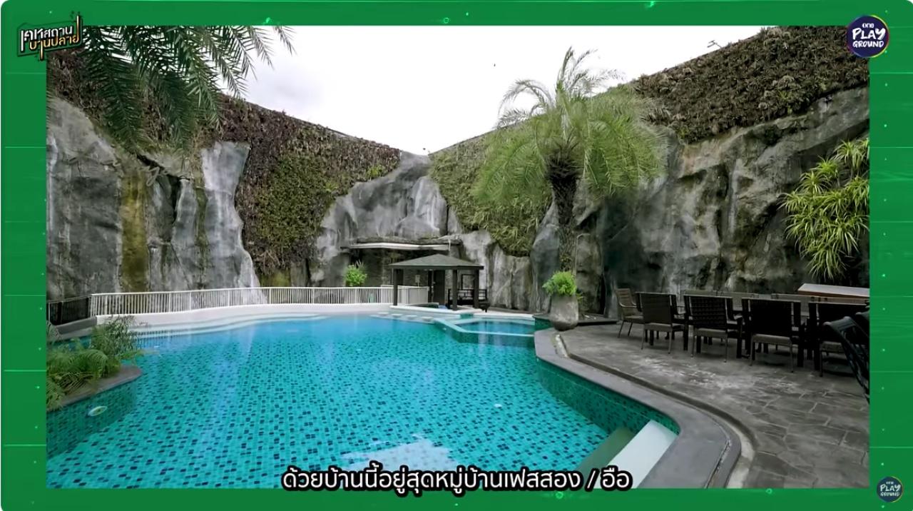 บ้านหลังนี้ใช้จัดอีเวนต์บ่อย และบริเวณสระน้ำที่สร้างไว้ ด้วยบ้านหลังนี้จะอยู่สุดหมู่บ้านเฟสสอง อยู่หัวมุมพอดี และข้างหลังเป็นคลอง เป็นสะพานน้ำ ก็ไม่รู้ว่าจะกั้นอะไรเพื่อให้คนมองเข้ามาไม่เห็น ก็เลยใช้ปูนปั้นเป็นภูเขาขึ้นมาล้อมรอบ หมดไปประมาณ 5 ล้านบาท ถามว่าบ้านหลังนี้อยู่กันกี่คน เป๊ก บอกว่าอยู่กัน 3 คน