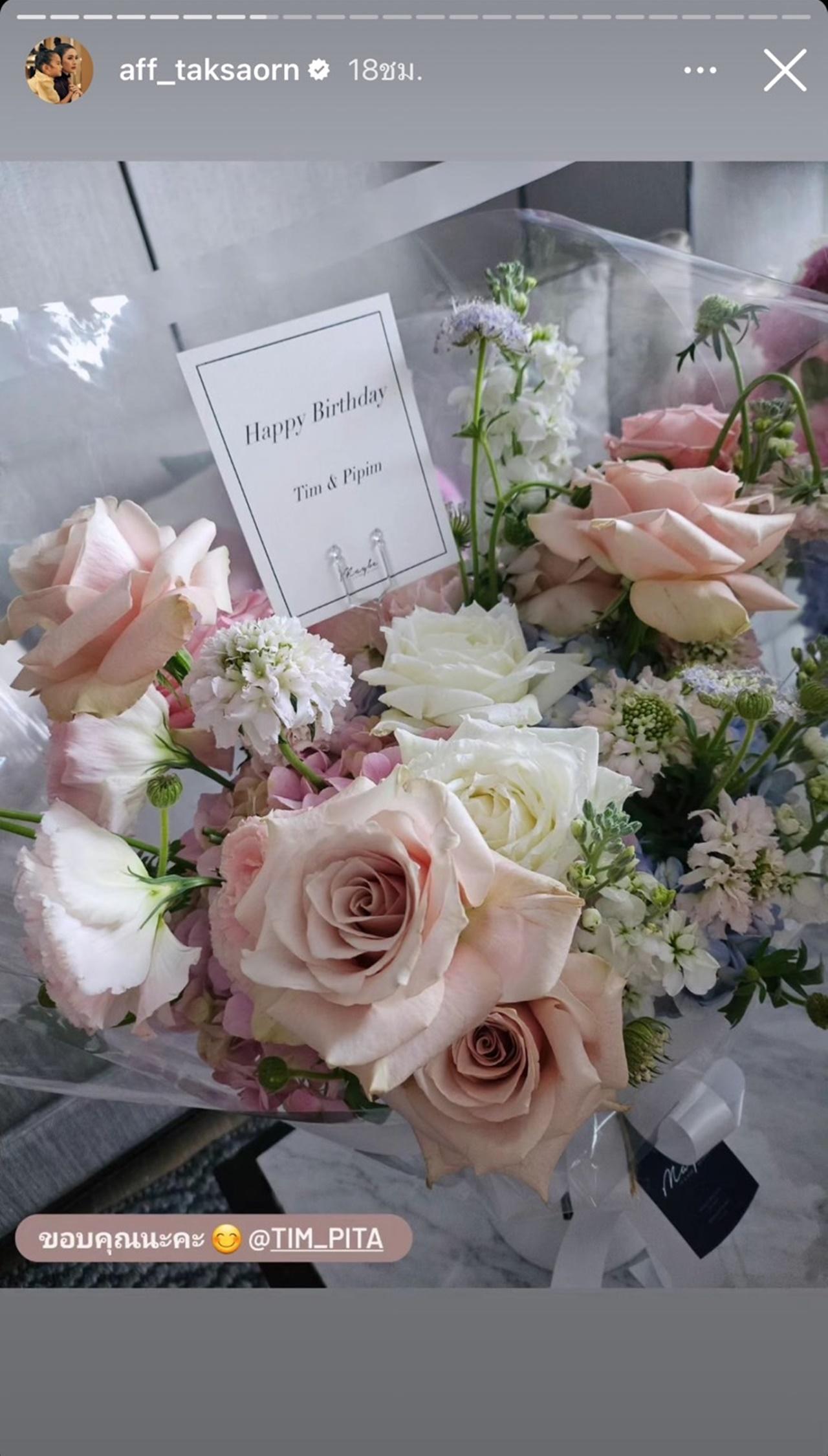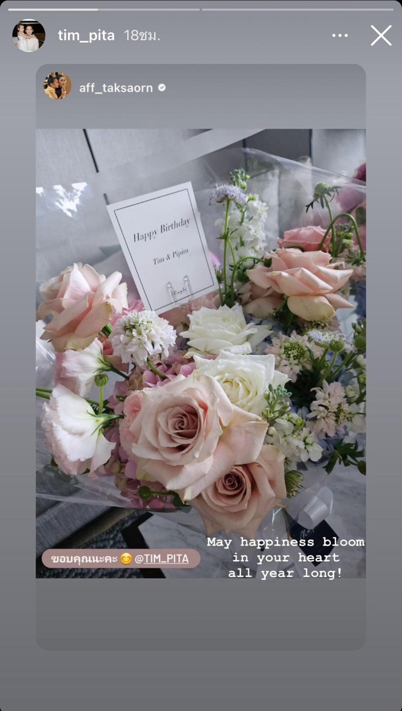 ซึ่ง แอฟ ได้ลงภาพดอกไม้ช่อดังกล่าวในไอจีสตอรี่พร้อมกับคำขอบคุณและแท็กไอจี @tim_pita จากนั้น ทิม ก็ได้โพสต์ตอบกลับลงไอจีสตอรี่ของตัวเองเช่นกันและอวยพรกลับอีกครั้งด้วยประโยคที่ว่า "May happiness bloom in your heart all year long" ต้องบอกว่า แม้ตัวของ ทิม จะอยู่นิวยอร์ก แต่ก็ไม่ลืมวันสำคัญของมิตรภาพดีๆ ซึ่งเป็นโมเมนต์ที่น่ารักมากๆ เลยทีเดียว.