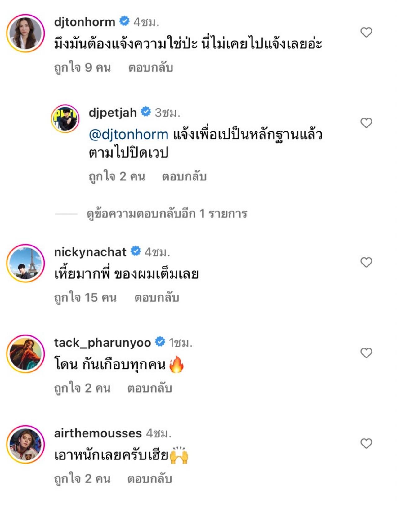 งานนี้ด้านคนบันเทิงที่ติดตาม ได้เข้ามาคอมเมนต์กันจำนวนมาก โดยบอกว่าเจอแบบนี้เหมือนกัน และแนะนำให้ ดีเจเพชรจ้า ไปแจ้งความ อาทิ ดีเจต้นหอมบอกว่า มึงมันต้องแจ้งความใช่ปะ นี่ไม่เคยไปแจ้งเลยอะ, แทค ภรัณยู บอกว่า โดนกันเกือบทุกคน, นิกกี้ ณฉัตร บอกว่า เxี้ยมากพี่ ของผมเต็มเลย เป็นต้น.