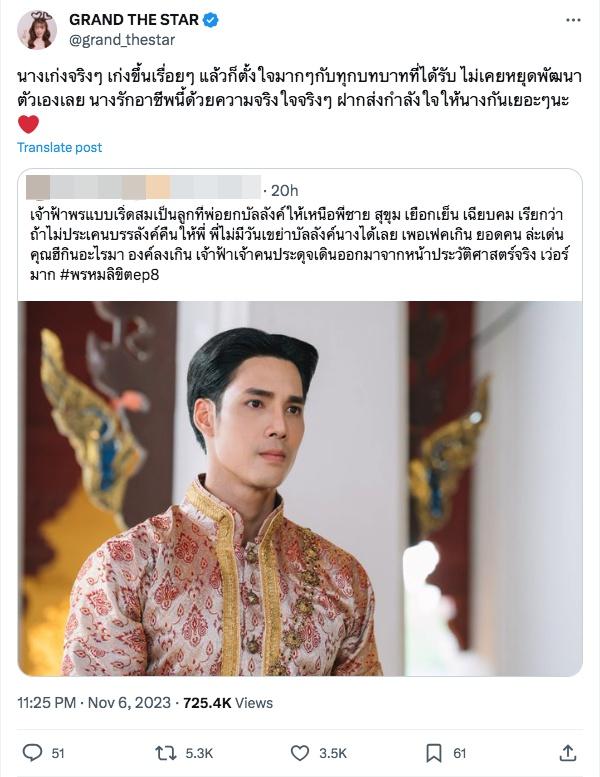 งานนี้อดีตคนรักอย่างนักร้องนักแสดงสาว แกรนด์ กรณ์ภัสสร ด้วยเศียรเกล้า หรือ แกรนด์ เดอะสตาร์ น้องสาวของ เกรซ กาญจน์เกล้า ก็ชื่นชมในฝีมือของ เด่นคุณ เช่นกัน แถมยังแชร์โพสต์ของคนที่ชื่นชมการแสดงของ เด่นคุณ ผ่านทางทวิตเตอร์ (X) พร้อมทั้งเขียนข้อความว่า “นางเก่งจริงๆ เก่งขึ้นเรื่อยๆ แล้วก็ตั้งใจมากๆ กับทุกบทบาทที่ได้รับ ไม่เคยหยุดพัฒนาตัวเองเลย นางรักอาชีพนี้ด้วยความจริงใจจริงๆ ฝากส่งกำลังใจให้นางกันเยอะๆ นะ”