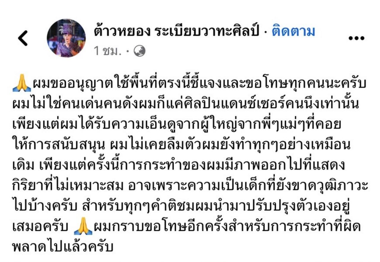 ล่าสุด ต้าวหยอง ก็ได้ออกมาโพสต์ข้อความชี้แจงถึงเรื่องดังกล่าว พร้อมกับขอโทษทุกคนที่แสดงกิริยาไม่เหมาะสม ตนเองไม่ใช่คนดัง เป็นแค่แดนเซอร์ที่ได้รับความเอ็นดูจากผู้ใหญ่ ไม่เคยลืมตัวเลย