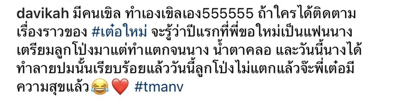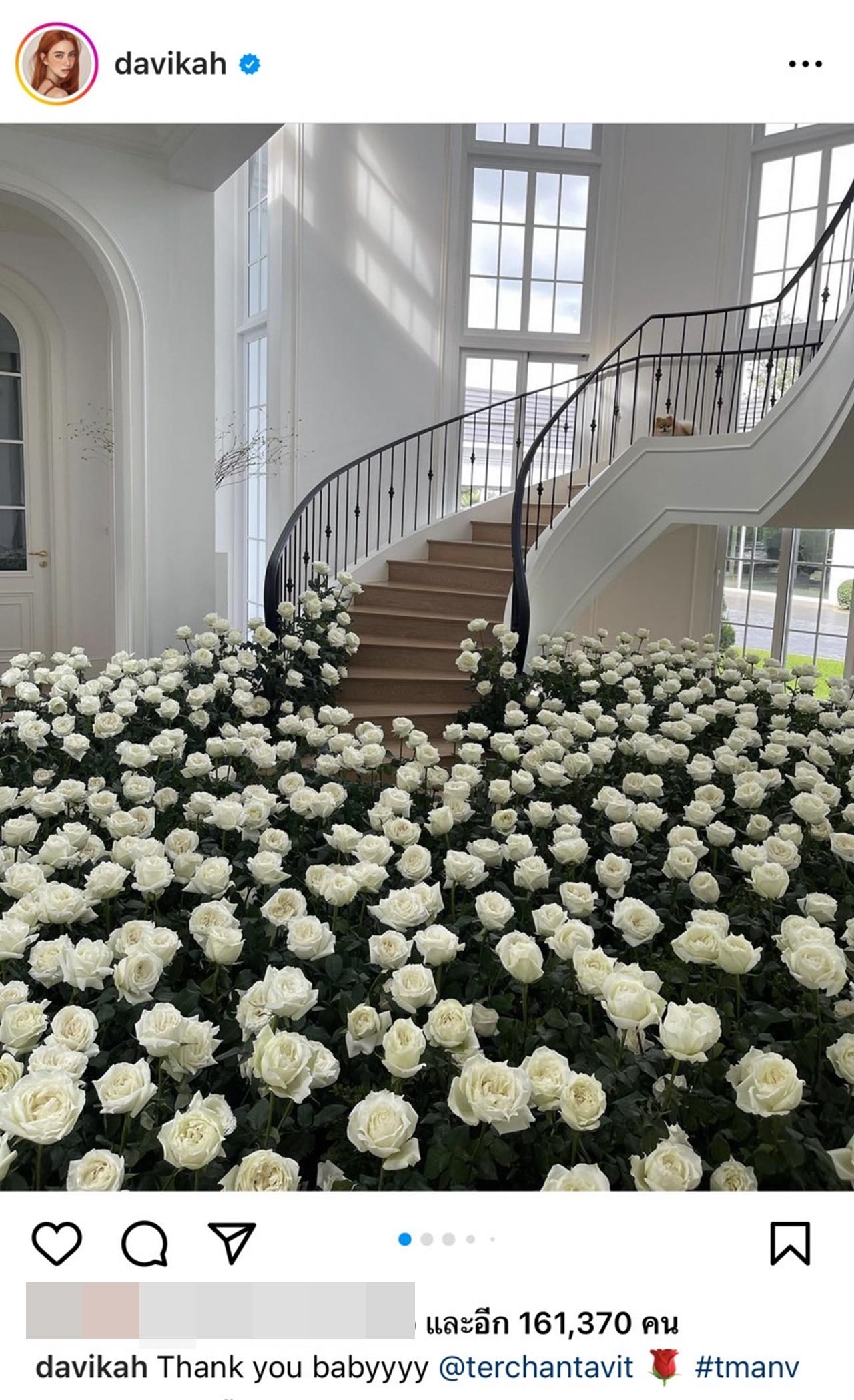 ทางด้าน ใหม่ ดาวิกา ก็ได้ลงภาพทุ่งดอกกุหลาบสีขาว พร้อมเขียนข้อความขอบคุณ ลุงเต๋อ สุดที่รักว่า "Thank you babyyyy @terchantavit #tmanv" และ "มีคนเขิล ทำเองเขิลเอง555555 ถ้าใครได้ติดตามเรื่องราวของ #เต๋อใหม่ จะรู้ว่าปีแรกที่พี่ขอใหม่เป็นแฟน นางเตรียมลูกโป่งมาแต่ทำแตกจนนางน้ำตาคลอ และวันนี้นางได้ทำลายปมนั้นเรียบร้อยแล้ว วันนี้ลูกโป่งไม่แตกแล้วจ๊ะ พี่เต๋อมีความสุขแล้ว"