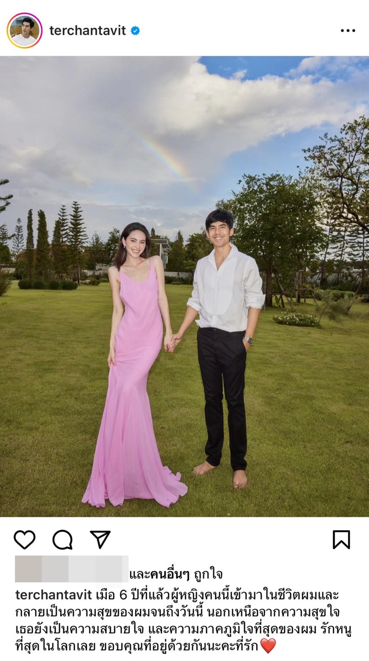 "เมื่อ 6 ปีที่แล้ว ผู้หญิงคนนี้เข้ามาในชีวิตผมและกลายเป็นความสุขของผมจนถึงวันนี้ นอกเหนือจากความสุขใจ เธอยังเป็นความสบายใจ และความภาคภูมิใจที่สุดของผม รักหนูที่สุดในโลกเลย ขอบคุณที่อยู่ด้วยกันนะคะที่รัก" และ "My love , my world , my everything"