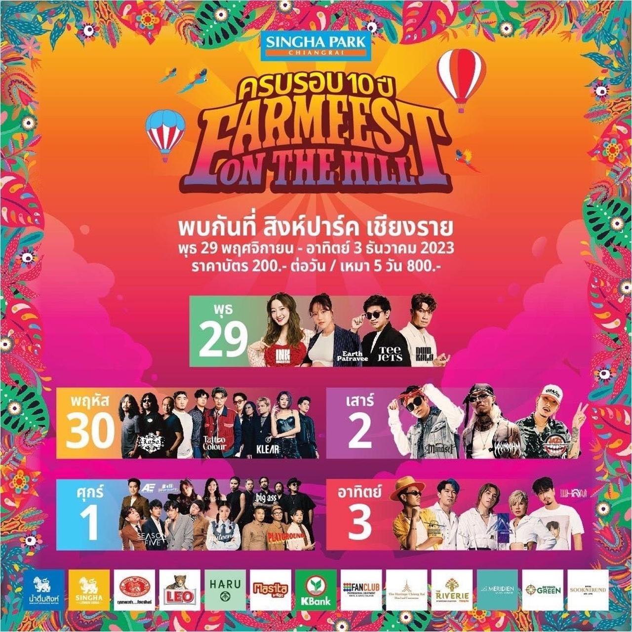 Farm Festival On The Hill ครั้งที่ 10 เทศกาลดนตรีที่ใหญ่ที่สุดของภาคเหนือ กับเวทีกลางแจ้งในบรรยากาศธรรมชาติ ท่ามกลางขุนเขาและลมหนาวของจังหวัดเชียงราย ขนทัพ 25 ศิลปินชื่อดังร่วมงานคับคั่งตลอด 5 วัน 5 คืน ตั้งแต่วันที่ 29 พฤศจิกายน – 3 ธันวาคม 66 ณ สิงห์ปาร์ค จังหวัดเชียงราย