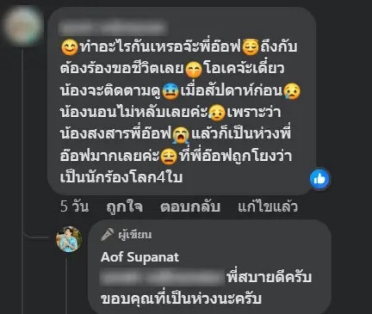 และ อ๊อฟ ก็ได้ตอบกลับสั้นๆ ว่า "พี่สบายดีครับ ขอบคุณที่เป็นห่วงนะครับ".