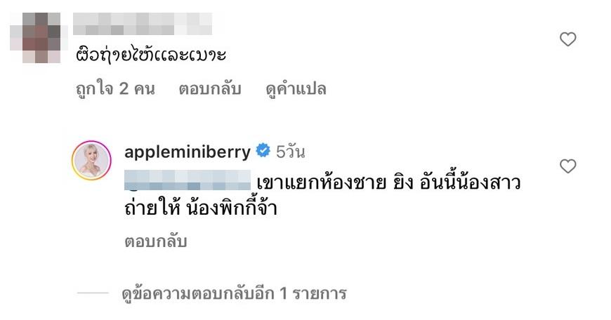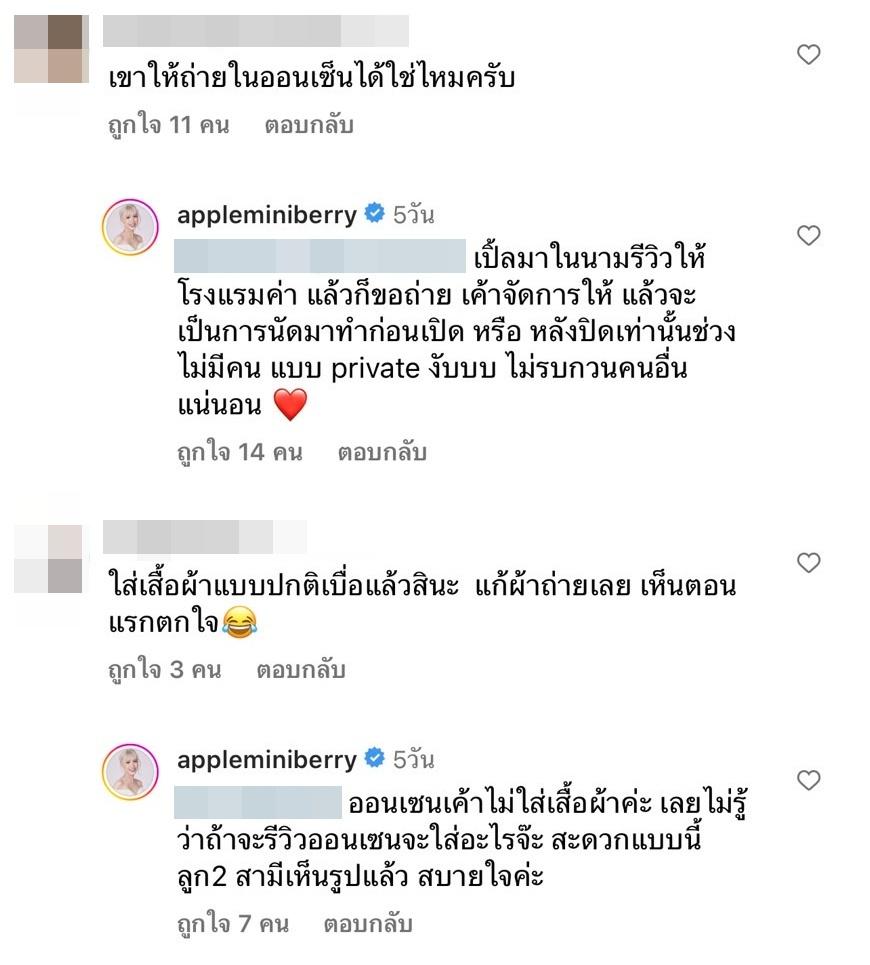 และมีชาวเน็ตที่เข้ามาคอมเมนต์ว่า “ผัวถ่ายให้แหละเนาะ” ก่อนที่ แอปเปิ้ล จะตอบกลับว่า “เขาแยกห้องชาย หญิง อันนี้น้องสาวถ่ายให้ น้องพิกกี้จ้า” ส่วนคอมเมนต์ที่ถามว่า “เขาให้ถ่ายในออนเซ็นได้ใช่ไหมครับ” แอปเปิ้ลตอบกลับว่า “เปิ้ลมาในนามรีวิวให้โรงแรมค่า แล้วก็ขอถ่าย เค้าจัดการให้ แล้วจะเป็นการนัดมาทำก่อนเปิด หรือ หลังปิดเท่านั้นช่วงไม่มีคน แบบ private งับบบ ไม่รบกวนคนอื่นแน่นอน”.