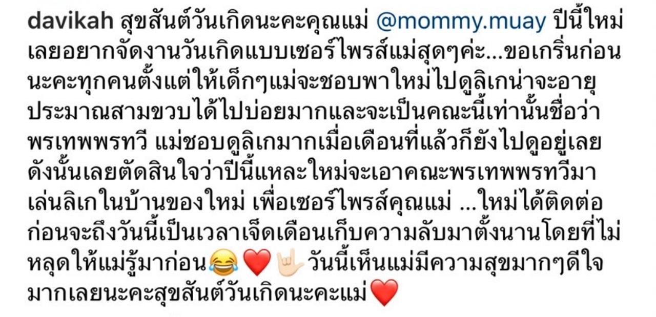ซึ่ง ใหม่ ได้เขียนเล่าเรื่องนี้ผ่านอินสตาแกรมว่า ตอนเด็กๆ คุณแม่ชอบพา ใหม่ ไปดูลิเกมากๆ และคณะโปรดก็คือ พรเทพ พรทวี เธอนั้นเก็บความลับไว้กว่า 7 เดือนเลยทีเดียว ในการติดต่อลิเกคณะนี้มาเล่นที่บ้าน เพื่อเซอร์ไพรส์วันเกิดคุณแม่