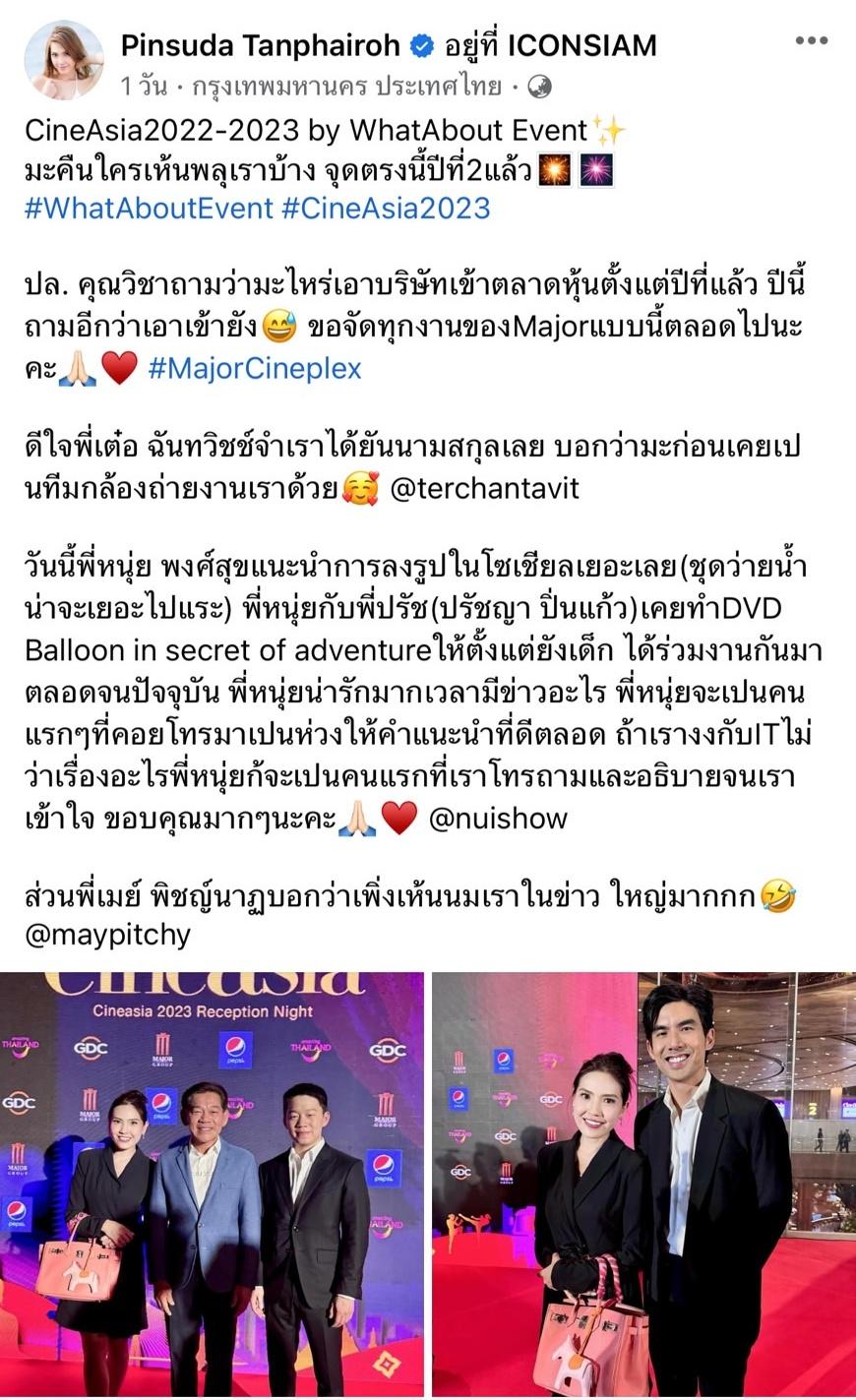 แต่ล่าสุด บอลลูน พินทุ์สุดา โพสต์ภาพและเขียนข้อความลงบนเฟซบุ๊กเกี่ยวกับผลงานล่าสุดของตัวเองซึ่งเป็นบริษัทงานอีเวนต์ อีกทั้งบอกว่าดีใจที่พระเอกหนุ่ม เต๋อ ฉันทวิชช์ จำได้ แถมยังบอกว่าเมื่อก่อนเป็นทีมกล้องถ่ายงานของตนด้วย