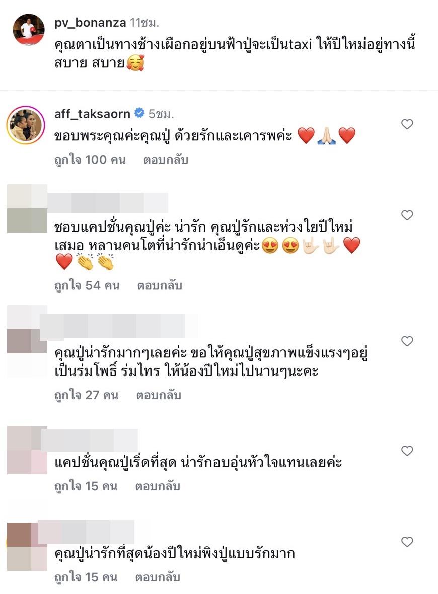 ซึ่ง แอฟ ทักษอร ก็ได้เข้ามาคอมเมนต์ตอบกลับว่า “ขอบพระคุณค่ะคุณปู่ ด้วยรักและเคารพค่ะ” รวมไปถึงแฟนๆ ที่ต่างแสดงความคิดเห็น อาทิ ชอบแคปชั่นคุณปู่ค่ะ น่ารัก คุณปู่รักและห่วงใยปีใหม่เสมอ หลานคนโตที่น่ารักน่าเอ็นดูค่ะ, คุณปู่น่ารักมากๆ เลยค่ะ ขอให้คุณปู่สุขภาพแข็งแรงๆ อยู่เป็นร่มโพธิ์ ร่มไทร ให้น้องปีใหม่ไปนานๆนะคะ, คุณปู่น่ารักที่สุด น้องปีใหม่พิงปู่แบบรักมาก, แคปชั่นคุณปู่เริ่ดที่สุด น่ารักอบอุ่นหัวใจแทนเลยค่ะ, ความรักความห่วงใยที่มีต่อหลานสาวเอ็นดูแคปชั่นปู่ ฯลฯ