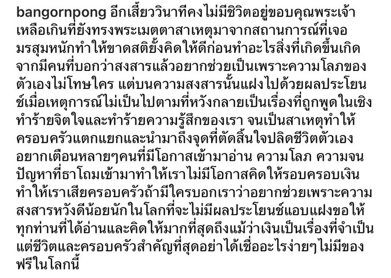 "อีกเสี้ยววินาทีคงไม่มีชิวิตอยู่ ขอบคุณพระเจ้าเหลือเกินที่ยังทรงพระเมตตา สาเหตุมาจากสถานการณ์ที่เจอมรสุมหนัก ทำให้ขาดสติยั้งคิดให้ดีก่อนทำอะไร สิ่งที่เกิดขึ้นเกิดจากมีคนที่บอกว่าสงสาร แล้วอยากช่วย เป็นเพราะความโลภของตัวเองไม่โทษใคร