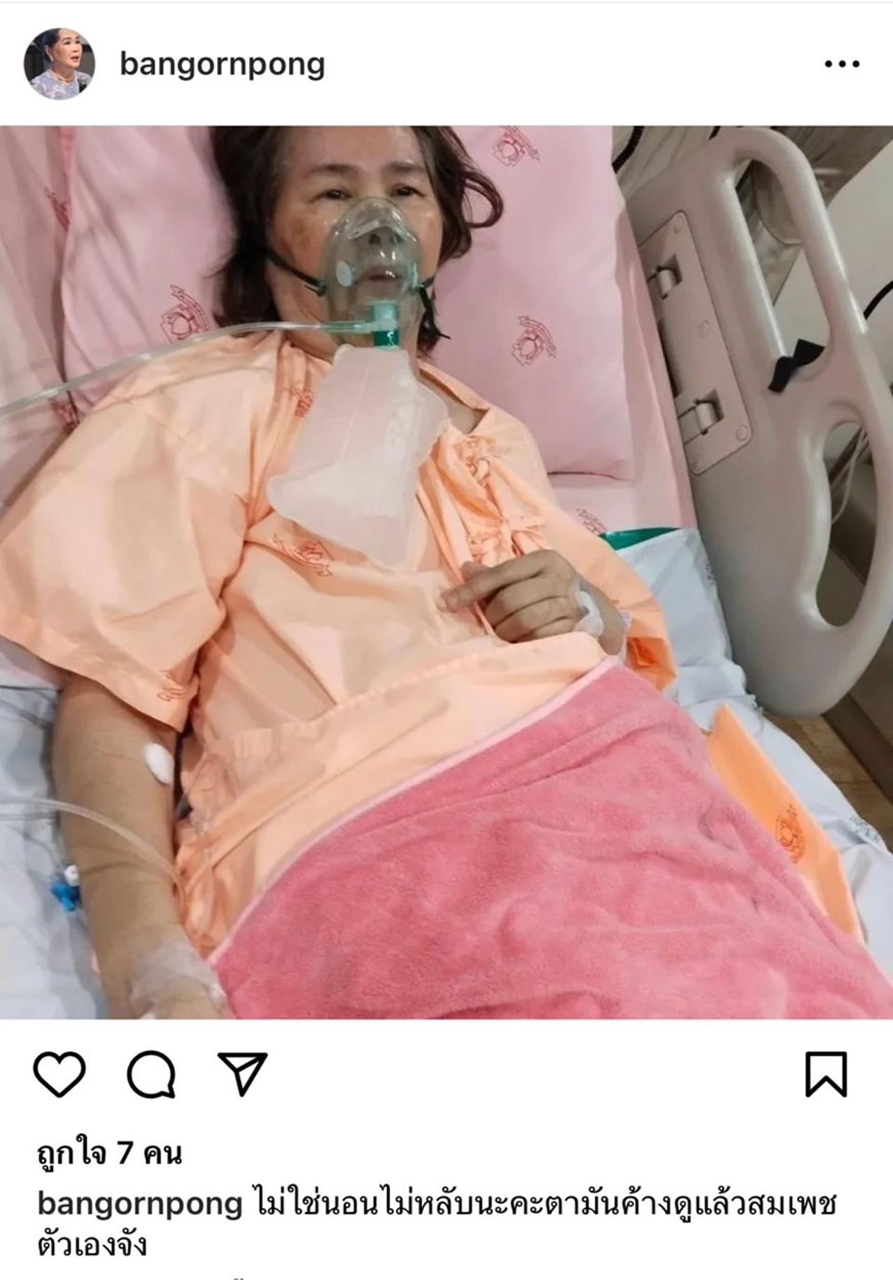ซึ่งล่าสุด คุณแม่บังอร ก็ได้ถึงมือคุณหมอ และอาการปลอดภัยแล้ว จากนั้นเจ้าตัวก็โพสต์ภาพที่นอนบนเตียงโรงพยาบาล พร้อมเขียนว่า "ไม่ใช่นอนไม่หลับนะคะ ตามันค้าง ดูแล้วสมเพชตัวเองจัง"