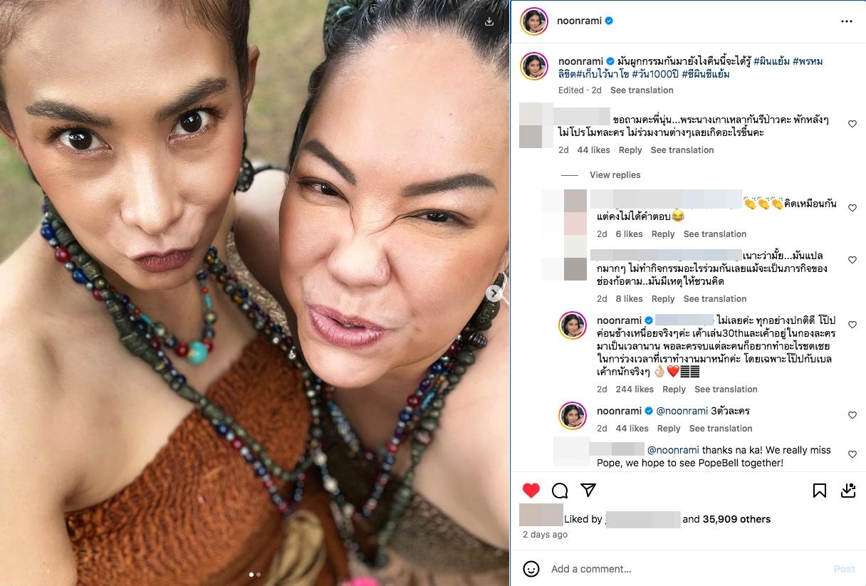 ซึ่ง นุ่น รมิดา ก็ตอบให้ชาวเน็ตได้หายสงสัยทันทีว่า “ไม่เลยค่ะ ทุกอย่างปกติดี โป๊ปค่อนข้างเหนื่อยจริงๆ ค่ะ เค้าเล่น 3 ตัวละคร และเค้าอยู่ในกองละครมาเป็นเวลานาน พอละครจบแต่ละคนก็อยากทำอะไรชดเชยในช่วงเวลาที่เราทำงานมาหนักค่ะ โดยเฉพาะโป๊ปกับเบลเค้าหนักจริงๆ”