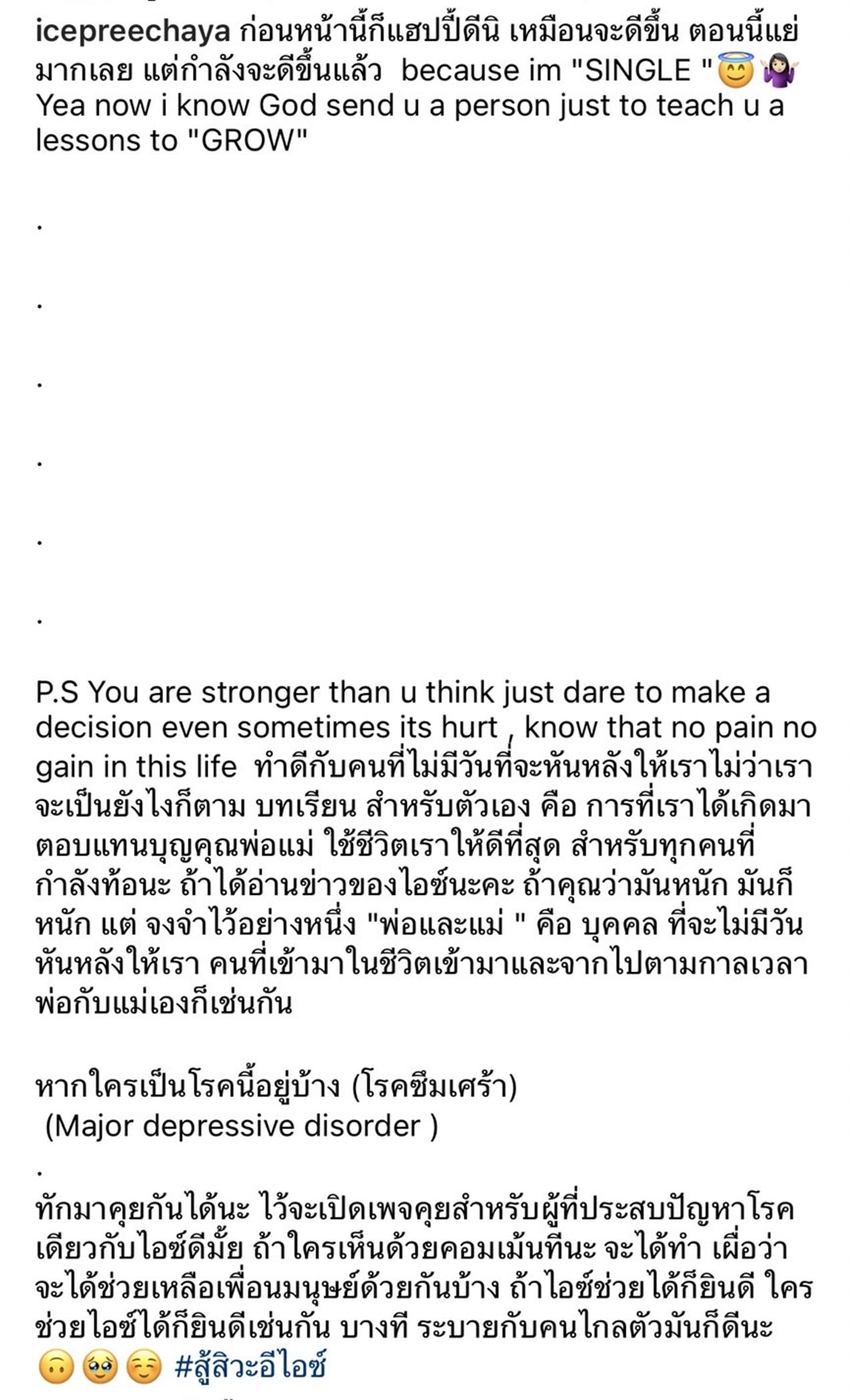 ส่วนที่ ไอซ์ โพสต์ว่าโสดและตัดพ้อเรื่องความรักนั้น ก็ต้องรอฟังจากปากของเจ้าตัวอีกครั้ง.