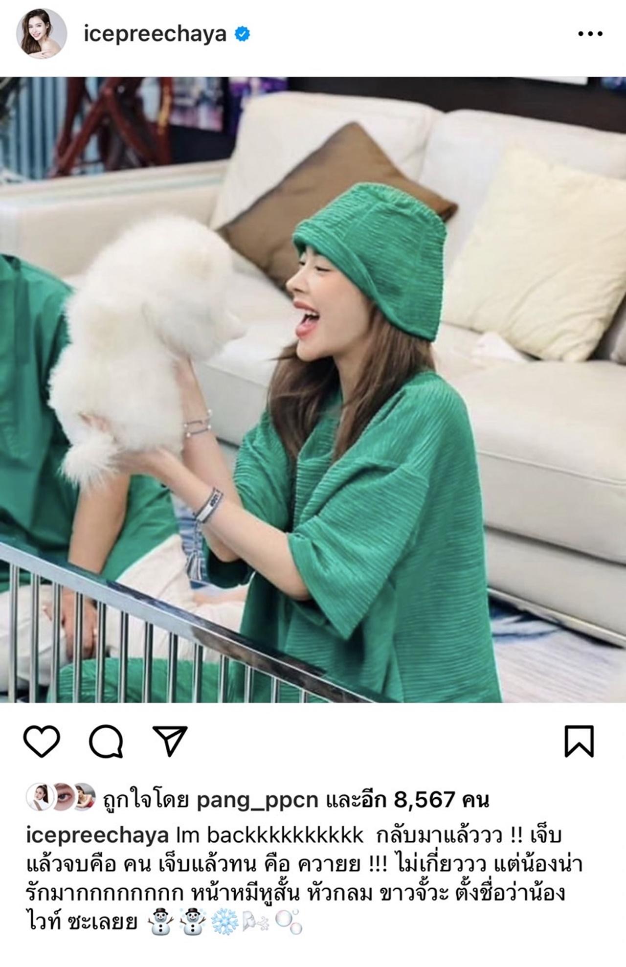 ล่าสุด ไอซ์ ก็ได้กลับมาโพสต์ภาพผ่านอินสตาแกรม โดยได้โพสต์ภาพตัวเองขณะอุ้มน้องหมาสีขาวจั๊วะ พร้อมเขียนว่า "Im backkkkkkkkkk กลับมาแล้ววว !! เจ็บแล้วจบคือ คน เจ็บแล้วทน คือ ควายย !!! ไม่เกี่ยววว แต่น้องน่ารักมากกกกกกกก หน้าหมีหูสั้น หัวกลม ขาวจั๊วะ ตั้งชื่อว่าน้อง ไวท์ ซะเลยย"