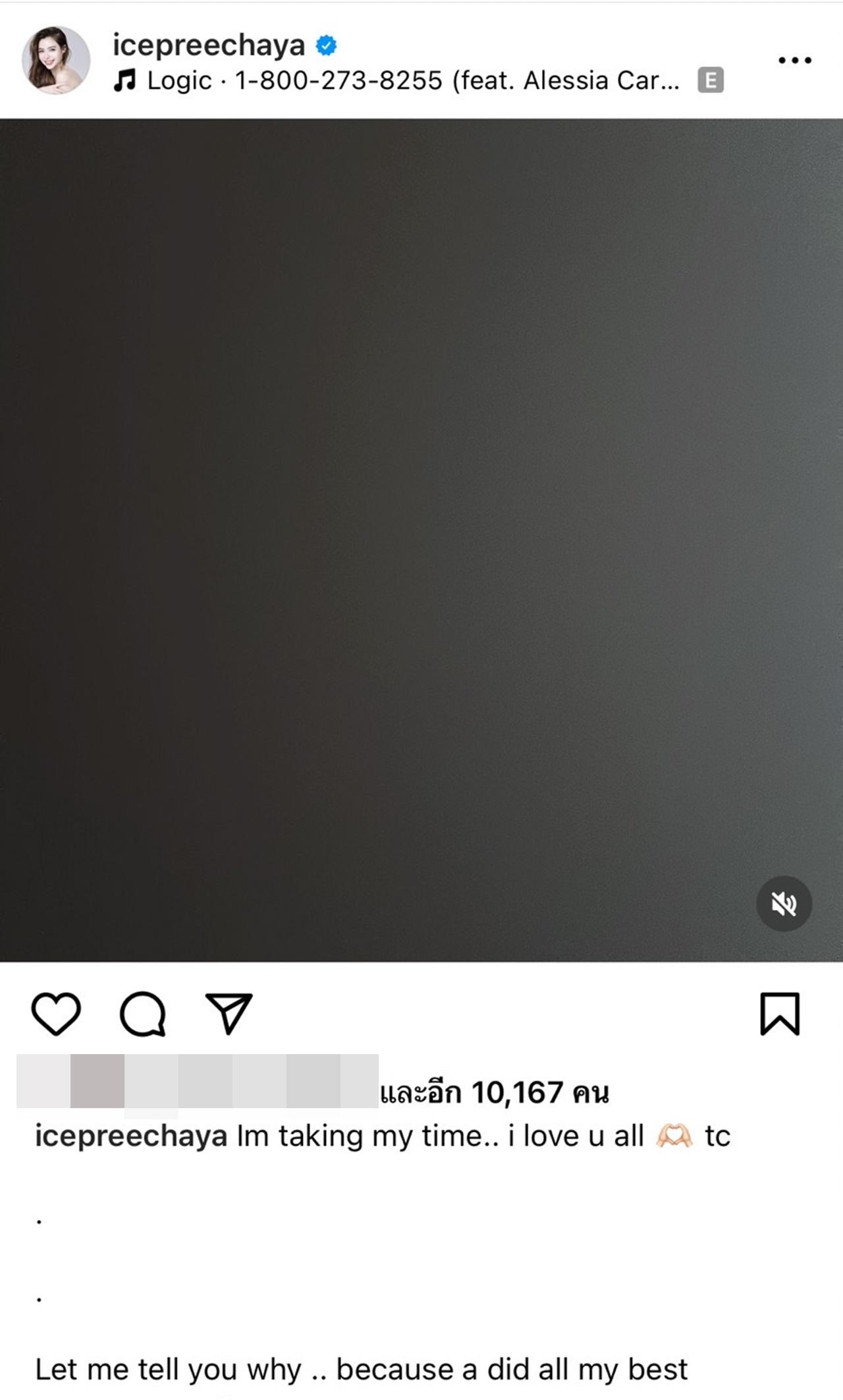 จากนั้นทางด้าน ไอซ์ ก็ได้โพสต์ภาพจอสีเทา พร้อมเขียนข้อความว่า "Im taking my time.. i love u all tc Let me tell you why .. because a did all my best" (ฉันให้เวลากับตัวเอง ฉันรักพวกคุณทุกคน ดูแลตัวเองนะ เดี๋ยวจะบอกเหตุผลให้ฟัง เพราะฉันทำเต็มที่ ทำดีที่สุดแล้ว) ซึ่งทุกคนต่างเข้ามาส่งกำลังใจให้ ไอซ์ กันจำนวนมาก