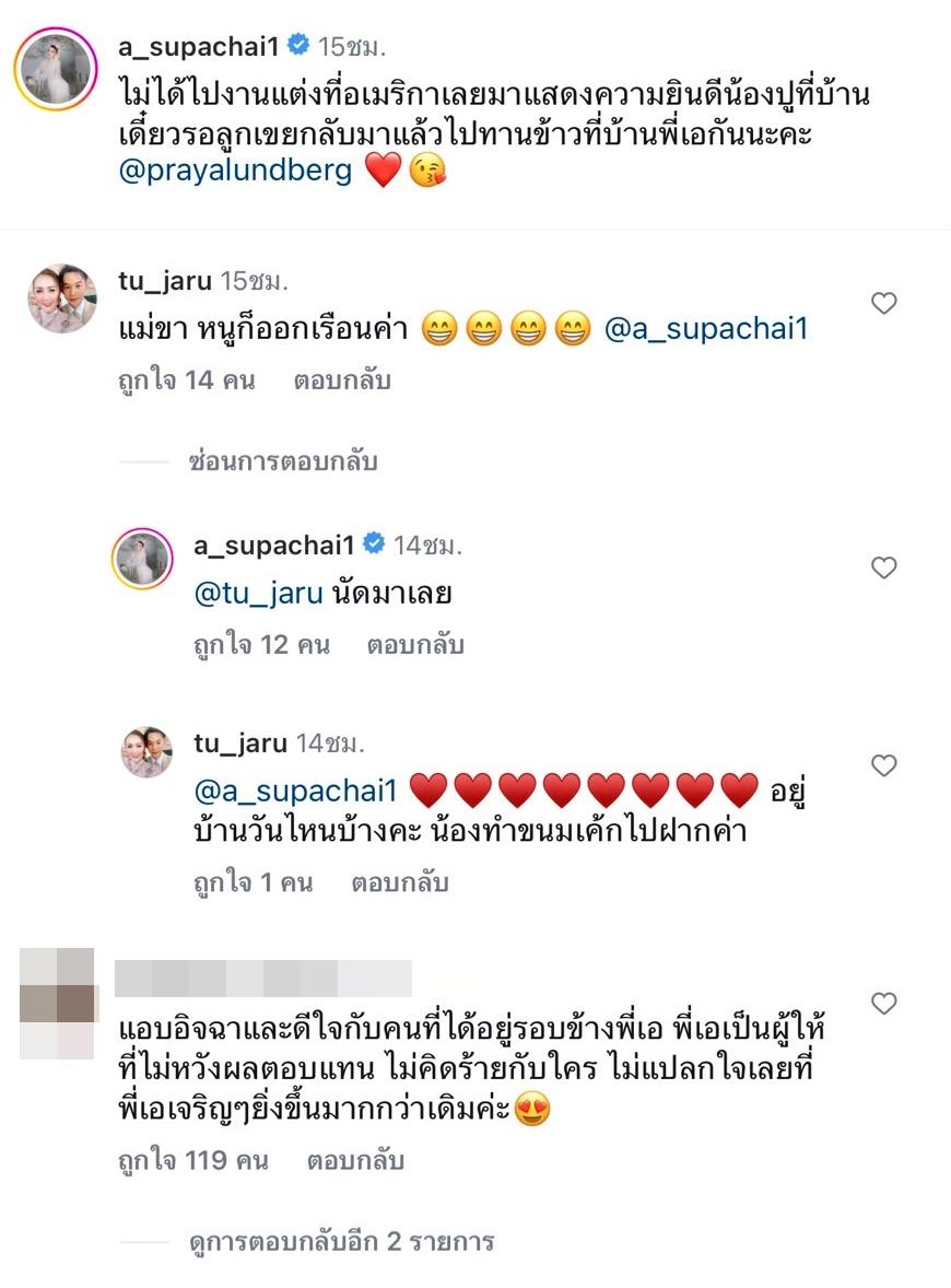 โดยในอินสตาแกรม @a_supachai1 ได้โพสต์คลิปนาทีที่ เอ-ปู ได้เจอกัน และ เอ หยิบเงินปึกใหญ่ให้ ปู ซึ่งนางเอกสาวยิ้มแย้มด้วยความปลื้มใจมากๆ ก่อนจะยกมือไหว้ขอบคุณ พร้อมทั้งเขียนแคปชั่น “ไม่ได้ไปงานแต่งที่อเมริกาเลยมาแสดงความยินดีน้องปูที่บ้าน เดี๋ยวรอลูกเขยกลับมาแล้วไปทานข้าวที่บ้านพี่เอกันนะคะ @prayalundberg”
