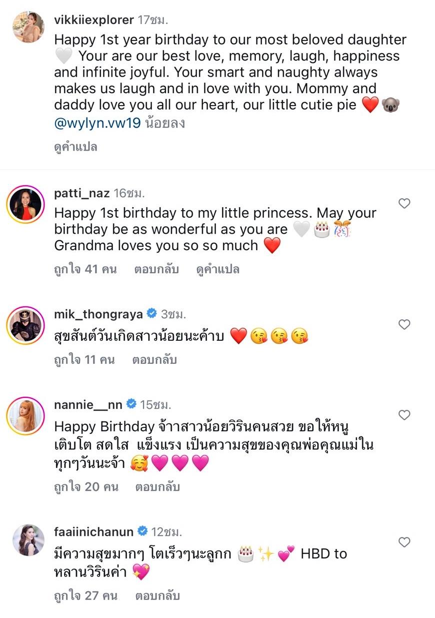 โดยนอกจากจะมีคนในวงการบันเทิงและแฟนๆ ร่วมอวยพรวันเกิด น้องวิริน เป็นจำนวนมากแล้ว ด้านคุณแม่ของเวียร์ก็ได้เข้ามาคอมเมนต์อวยพรหลานสาวว่า “Happy 1st birthday to my little princess. May your birthday be as wonderful as you are Grandma loves you so so much”.