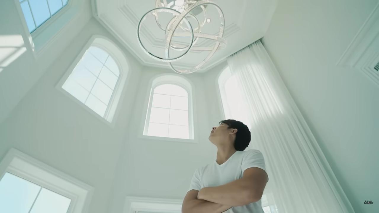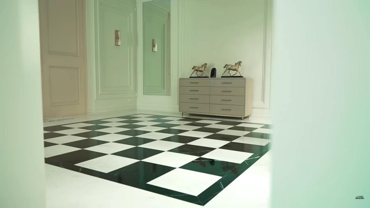 ส่วนห้องแรกที่เข้ามาคือโซนห้องโถง พื้นเป็นลายหมากกรุก ชื่อหมาก ต้องมีความเป็นหมากอยู่ในบ้าน เดินเข้ามาก็จะเห็นข้างหลังด้วย ซึ่งสวนข้างหลังตั้งใจมากๆ ว่าจะให้เห็นสวนกลางบ้าน ซึ่งเป็นสวนที่ตั้งใจจะมานั่งอ่านบทละคร ทำสมาธิ จุดกลางบ้านน่าจะเป็นจุดที่ดี สงบ มีพลังงานดีๆ จากนั้น หมาก พามาถึงอีกโซนที่เป็นห้องสีขาวว่างเปล่า ยังคิดไม่ออกจะแต่งเป็นโซนอะไร ตอนแรกอยากได้ห้องนี้เพราะว่าอยากมีโต๊ะตรงกลาง เพื่อที่น้องคิมจะได้จัดดอกไม้ตรงนี้ หาอะไรสวยๆ มาวาง ก่อนจะบอกแนะนำมาได้ว่าเอาไว้ทำอะไรดี ห้องนี้มีแชนเดอเลียร์และผ้าม่านสีขาว ช่วยให้บ้านซอฟต์ขึ้น ทำให้ดูอบอุ่น