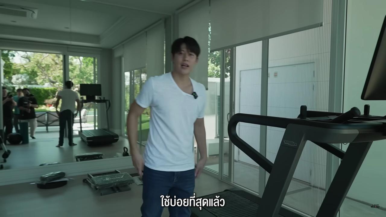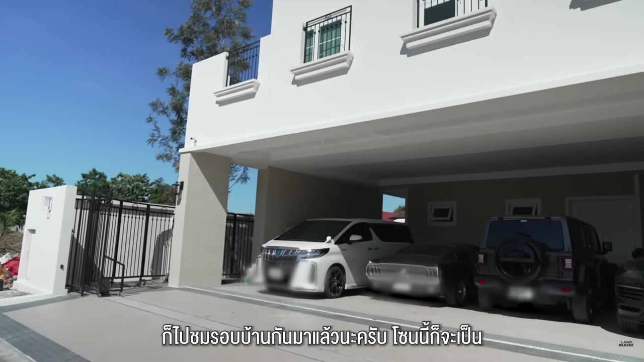 โซนฟิตเนสอยู่ถัดออกมาจากนอกตัวบ้านนิดหน่อย ซึ่งเป็นสถานที่ที่ใช้บ่อยมาก ส่วนข้างบ้านด้านหลังเป็นบ้านของ เป๊ก สัณณ์ชัย มาถึงโซนโรงรถซึ่งมีรถ 4 คัน ก็มีของน้องคิม มีรถตู้ และของตนเอง 2 คัน ซึ่งมีที่ชาร์จไฟรถด้วย ก่อนจะเล่าอีกว่าที่ดินตรงนี้พี่ชุเป็นคนแนะนำ เป็นที่ดินเปล่าในหมู่บ้าน แปลนบ้านเรา 2 คนวาดกับมือ ค่อยๆ วาดทีละห้องแล้วเอาแบบไปให้สถาปนิก แล้วให้อาจารย์ดูฮวงจุ้ยอีกที พลังคะแนนบ้านหลังนี้คือ 100% ซึ่งตรงนี้แล้วแต่คนจะเชื่อ