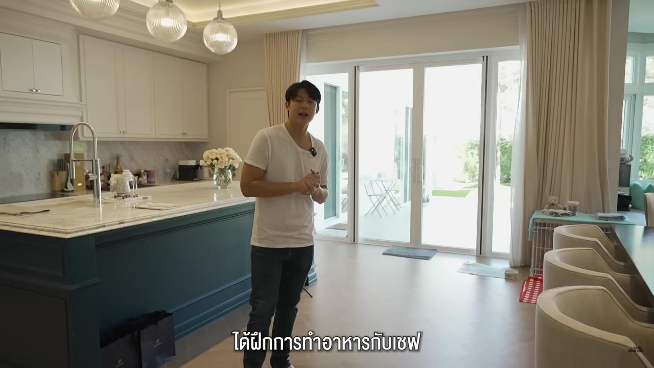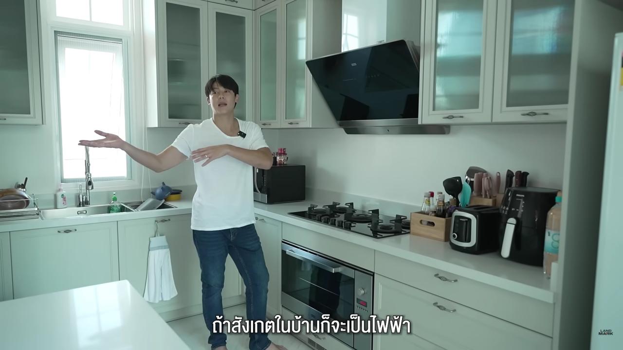 จากนั้นพาไปที่ห้องครัวซึ่งเป็นครัวฝรั่ง ซึ่งทั้งคู่ทำรายการ MarkKim + Chef ได้ฝึกการทำอาหารกับเชฟ 10 คนมาแล้ว ตรงนี้เลยตั้งใจจะให้เป็นที่ทำอาหาร แต่ยังไม่เคยใช้ ส่วนครัวไทยจะอยู่อีกฟากหนึ่ง ซึ่งครัวไทยจะใช้บ่อยมากๆ อีกทั้งยังมีโซนของน้องหมาที่รักเหมือนเป็นลูก ซึ่งวันแรกที่ย้ายมาเขาอยู่ไม่ได้และเห่า แต่ทุกวันนี้อยู่ได้แล้ว นอกจากนี้ที่บ้านยังมีโซนที่เป็นนุ๊ก อยากได้ฟีลนั้นมาเลยเพิ่มโซนนี้ไป เป็นมุมทานกาแฟตอนเช้า เปิดหน้าต่างรับลม ซึ่งบ้านหลังนี้ใช้โซลาร์เซลล์ด้วย